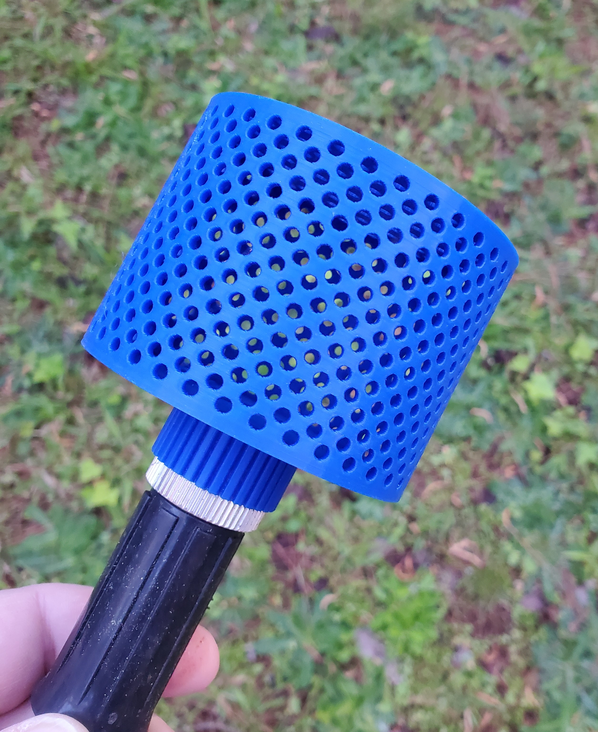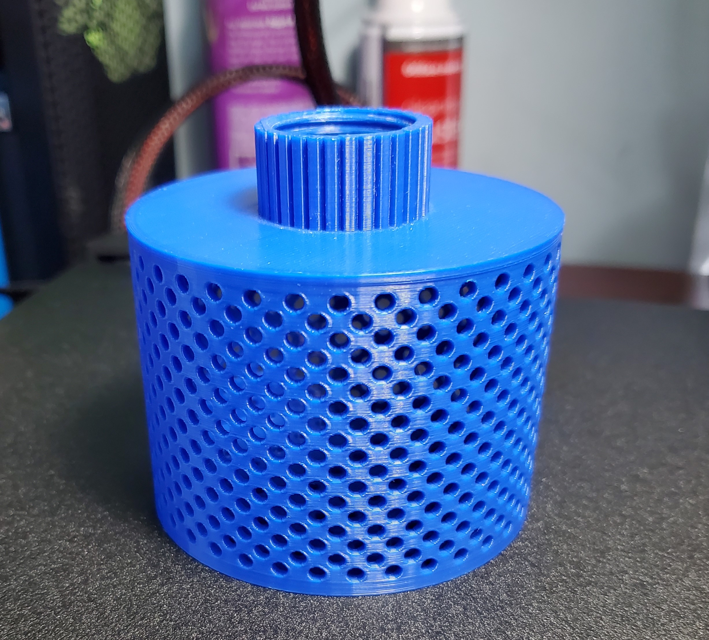 Giờ nghĩ lại, đáng lẽ tui nên in cái này màu cam hay vàng để dễ thấy trong nước đục hơn. Còn lại thì nó hoạt động hoàn hảo, cho một diện tích lớn để chặn lá/cành cây/v.v. làm nghẹt dòng nước và ngăn chúng làm gián đoạn việc hút nước.