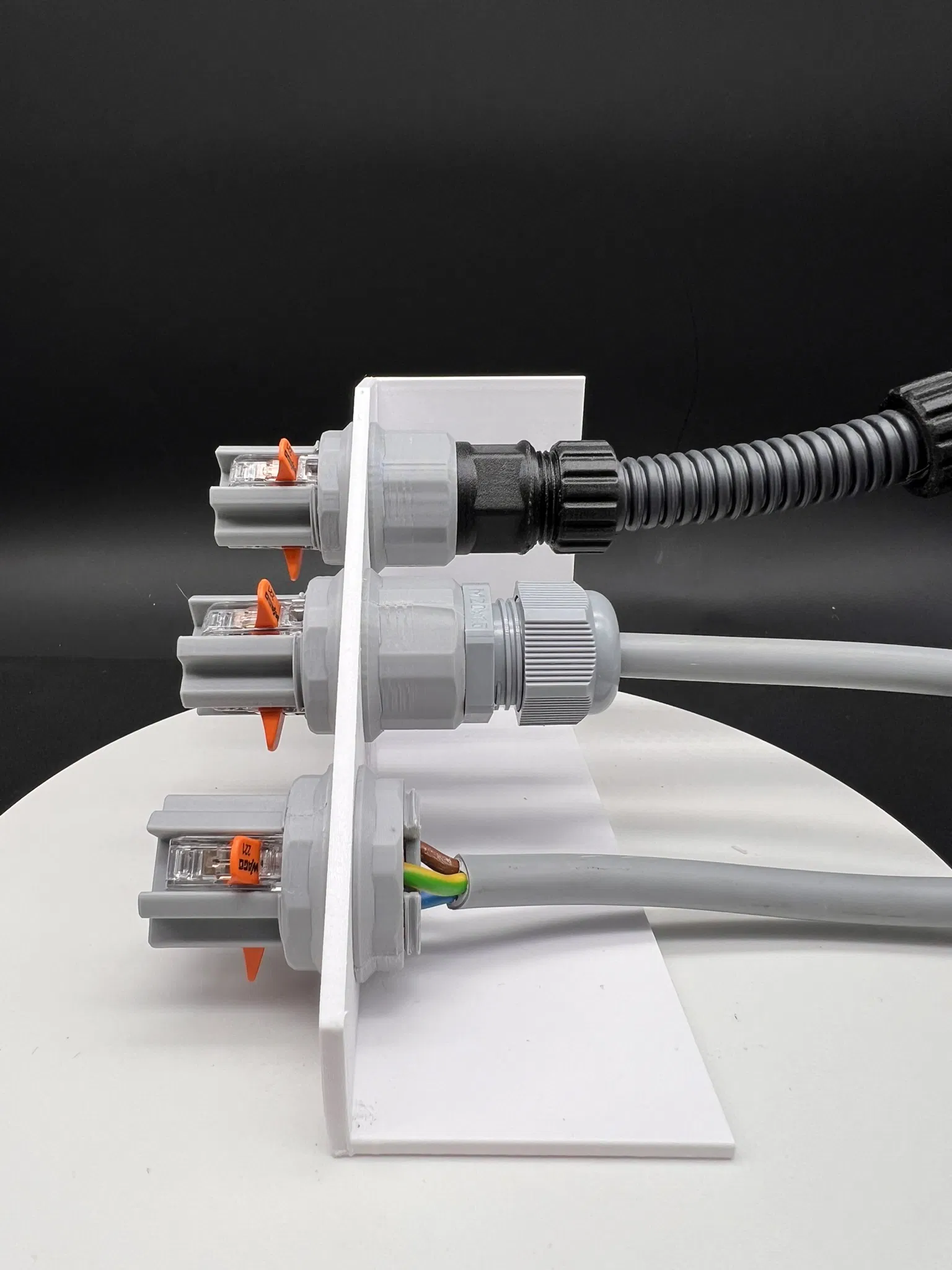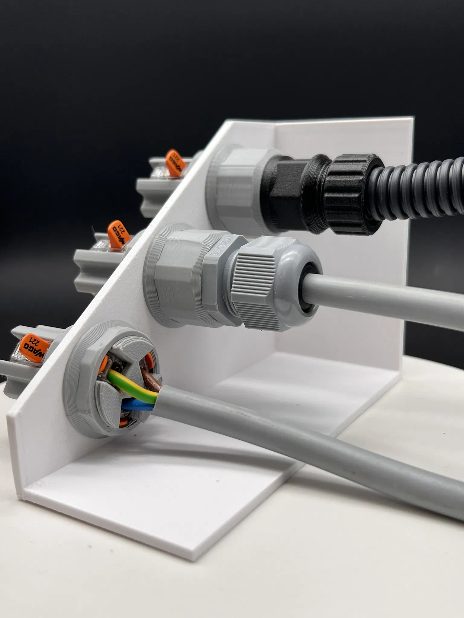 Đế nối xuyên tường dùng cho connector WAGO 221-411. Rất là tiện để đi dây điện vô hộp hoặc xuyên qua tường, hỗ trợ dây có 3 sợi. Có 3 kiểu kết nối: ống lượn sóng, gland (M20/M16/M12) hoặc nối thẳng.