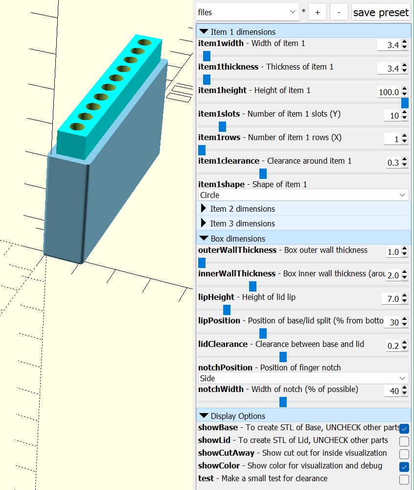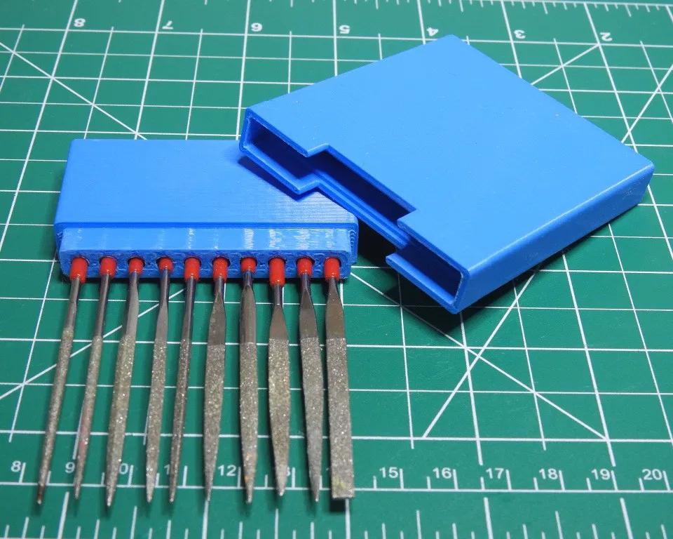 Một cái hộp xinh xinh để đựng bộ dũa kim mini của anh em. Thiết kế có thể tùy chỉnh thông số dễ dàng bằng file OpenSCAD, phù hợp cho các loại dũa có kích thước khoảng 3.3mm x 100mm.