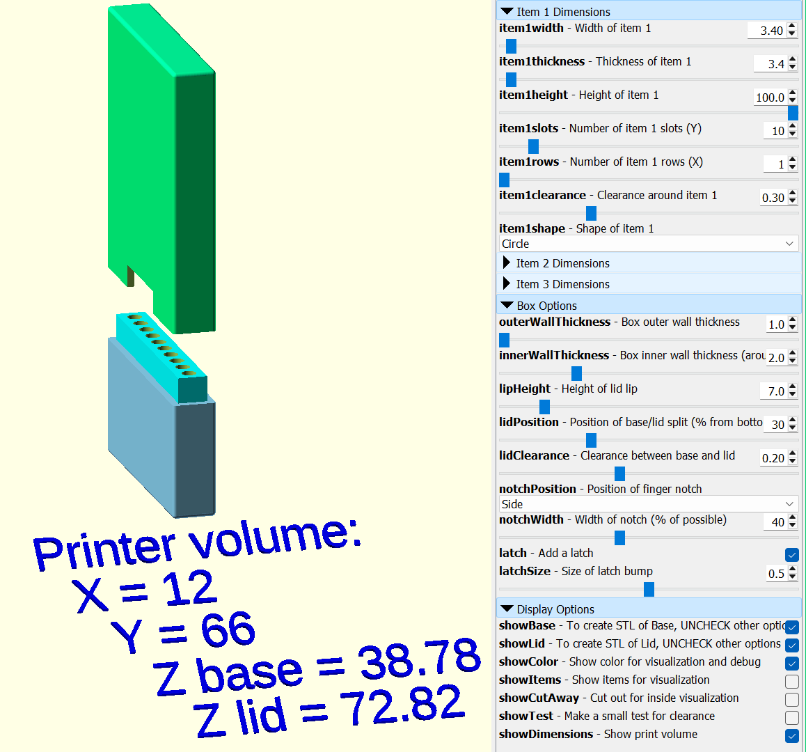 Để xem đầy đủ các thông số của hộp, hãy tải và cài đặt file JSON tùy chọn. Để sử dụng, đặt nó vào cùng thư mục với file OpenSCAD và bỏ phần “.txt” ở cuối tên file.