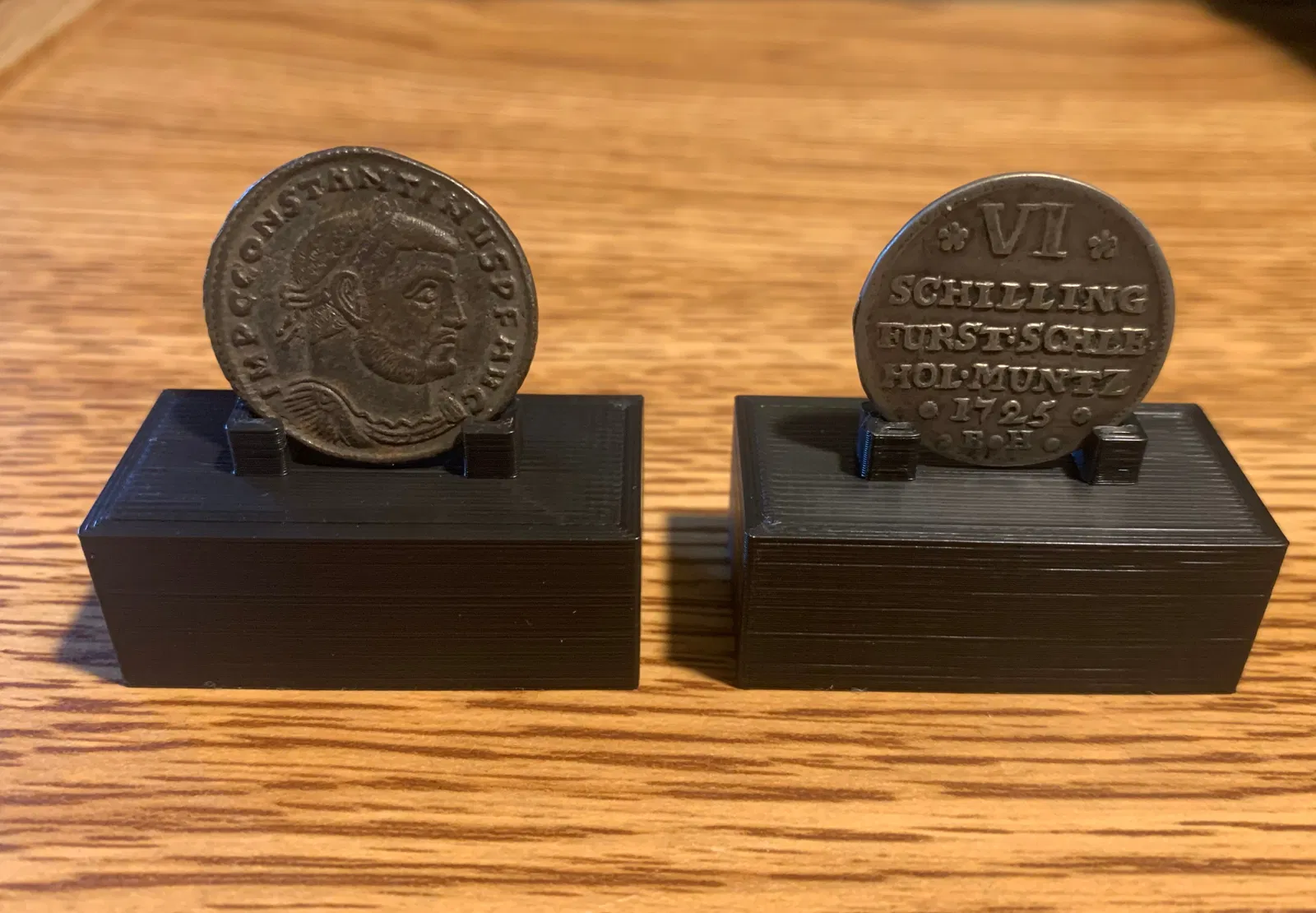 Chân đế trưng bày tiền xu dành cho người sưu tập tiền xu. Có 2 loại, một loại rộng 1.15mm cho tiền xu mỏng và loại rộng 1.8mm cho tiền xu dày hơn. In bằng máy Neptune 3 Pro với ~6 gram nhựa PLA trong 22 phút ở tốc độ 80mm/s.