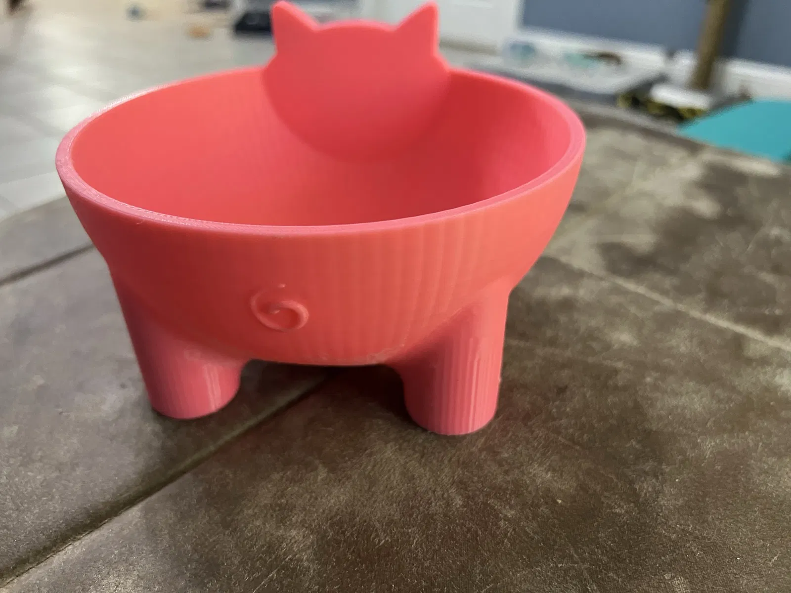 Một cái tô đựng snack có hình con heo, kích thước khoảng 150mm vuông. In bằng PLA trên máy Bambulab X1C với độ dày lớp 0.2mm, 100% độ đặc.