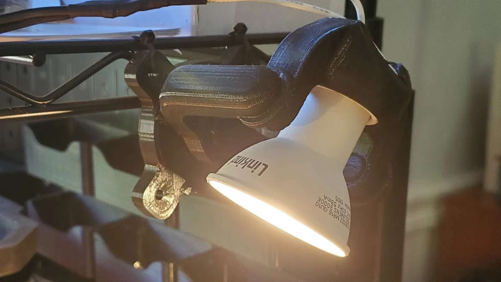 Chui đèn GU10 xoay được, giá phải chăng, đa năng, và sáng cho chỗ làm việc hoặc setup chụp ảnh. Dễ in, dễ lắp, có thể điều chỉnh hướng đèn tùy ý.