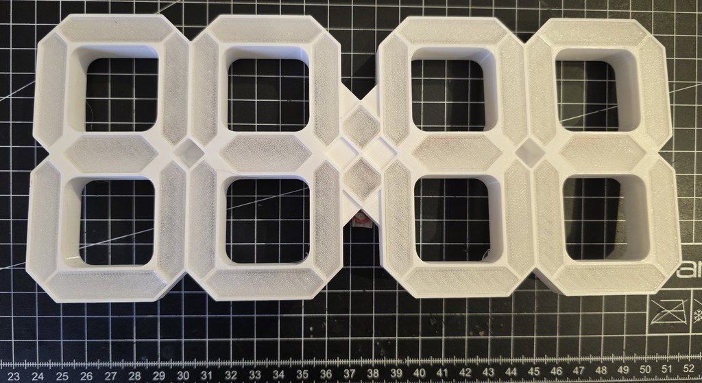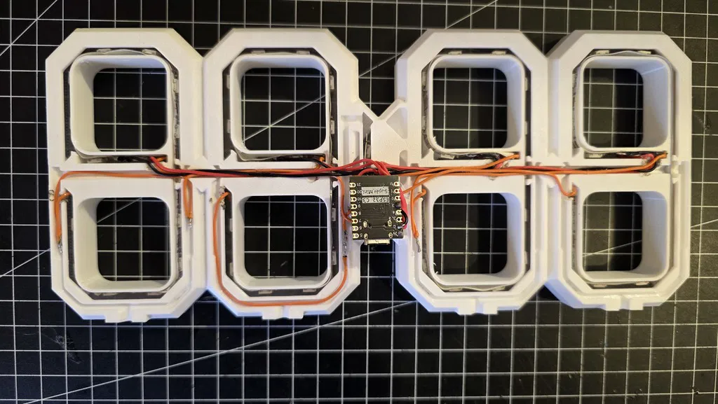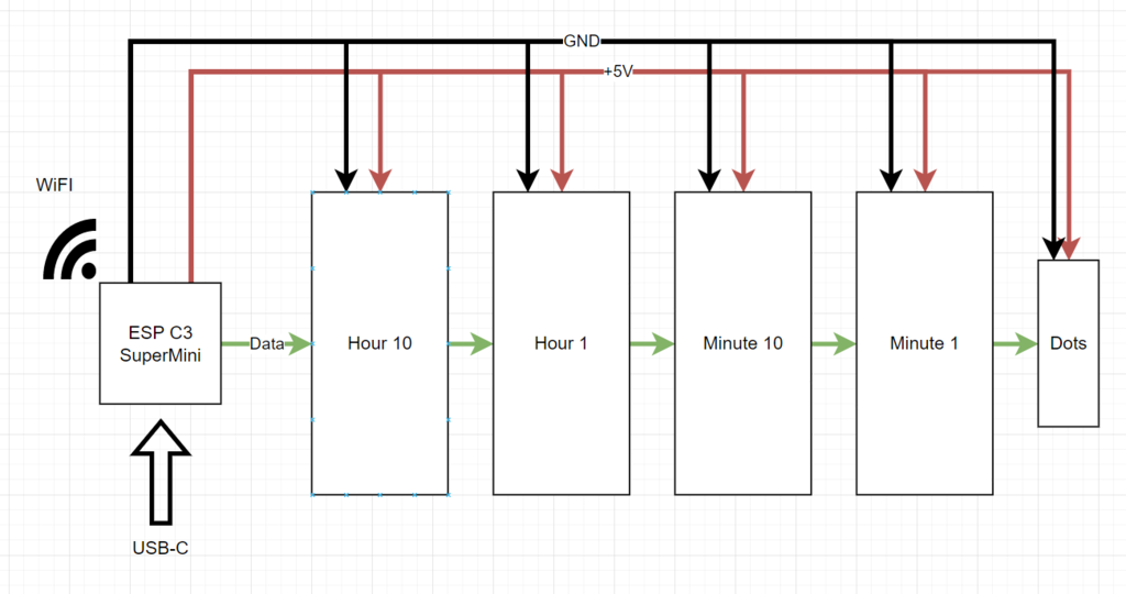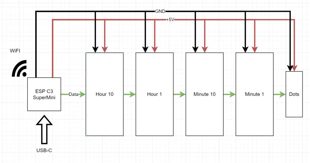 Tao cần một cái đồng hồ đơn giản để ở một phòng, nên tao tự thiết kế một cái. Màn hình 24 giờ sẽ được trang bị dải đèn LED WS2812B với 60 bóng đèn/mét. Mỗi chữ số sẽ cần 15 bóng đèn LED, hai bóng cho mỗi đoạn và một bóng đèn LED được giấu giữa hai đoạn. Tao đã làm dây nối kiểu lười biếng, chỉ cần nối tất cả các cực +5V và GND lại với nhau và với ESP C3 SuperMini. Dữ liệu đến từ Chân 3 và được nối giờ_10 -> giờ_1 -> phút_10 -> phút_1 -> 2x dấu chấm ở giữa. Tổng cộng 62 bóng đèn LED.