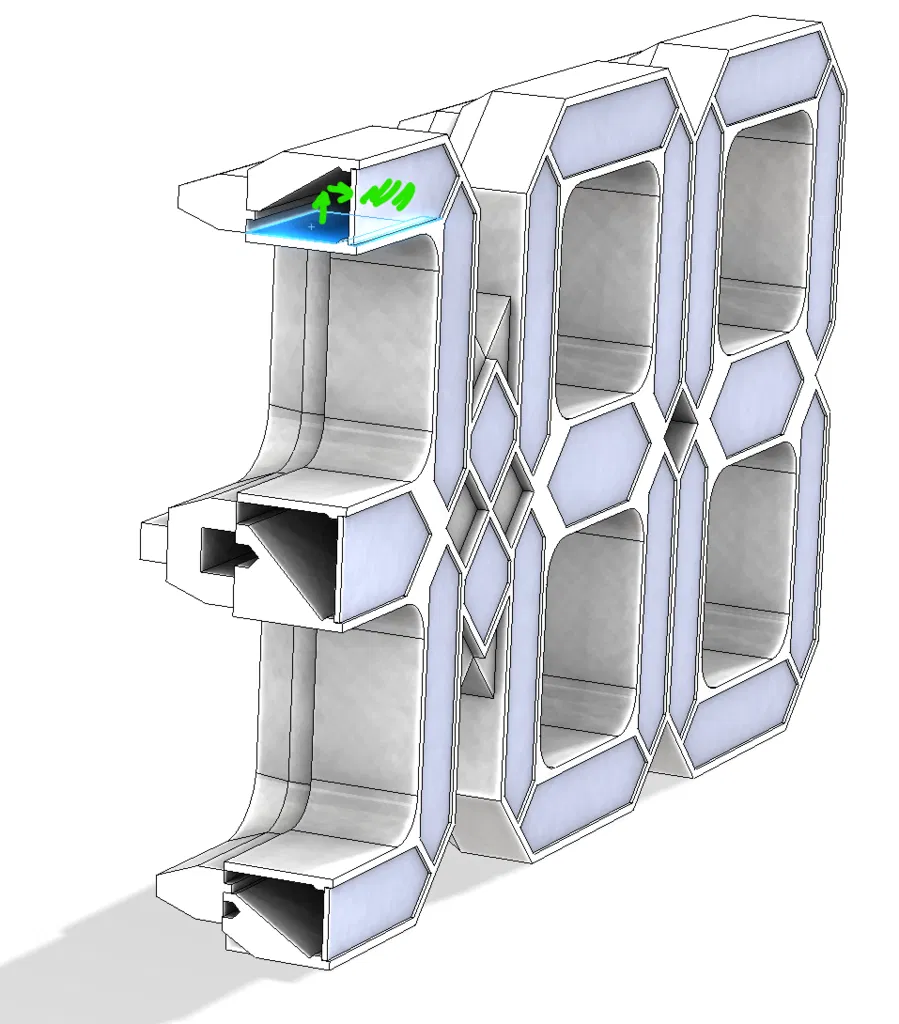 Dải đèn LED được gắn vào tường bên trong, tường bên ngoài là bộ phản xạ được vát cạnh. Mặt sau được đóng lại bằng một tấm đáy, có các rãnh và chỉ cần dán lại với nhau.