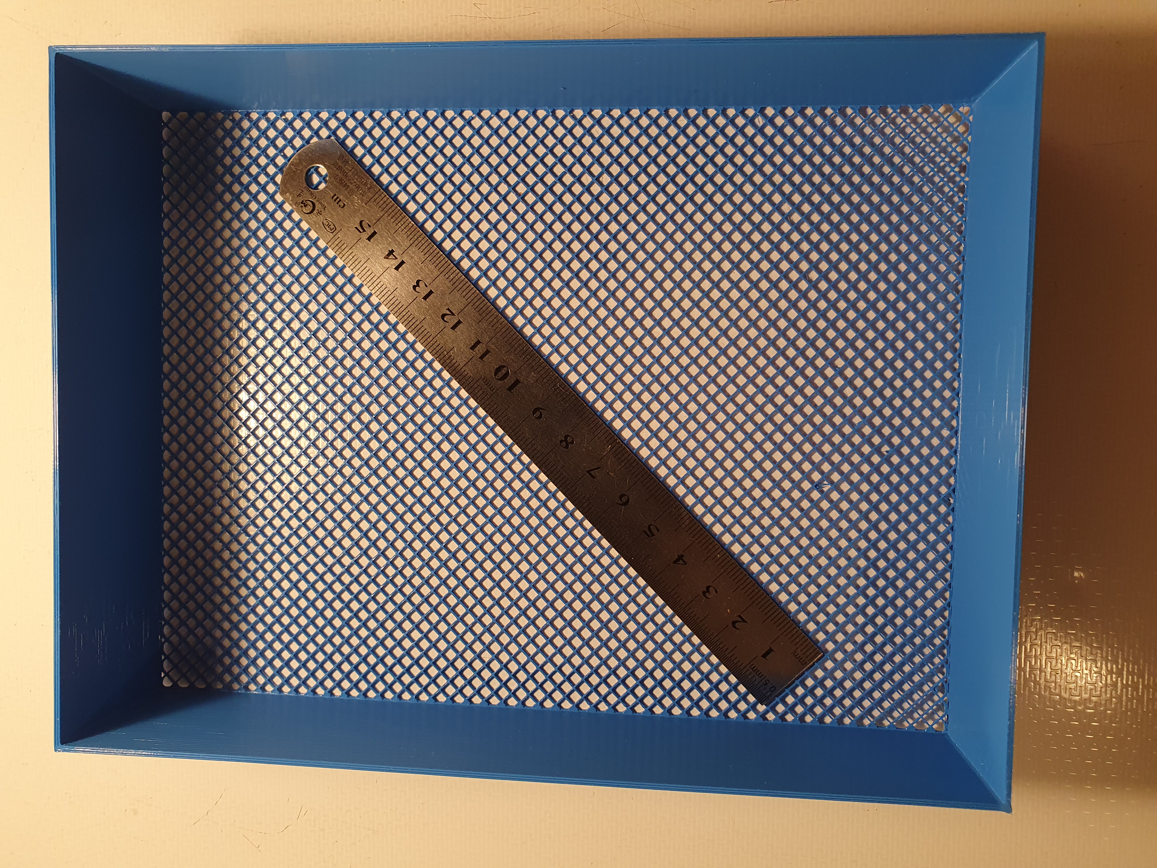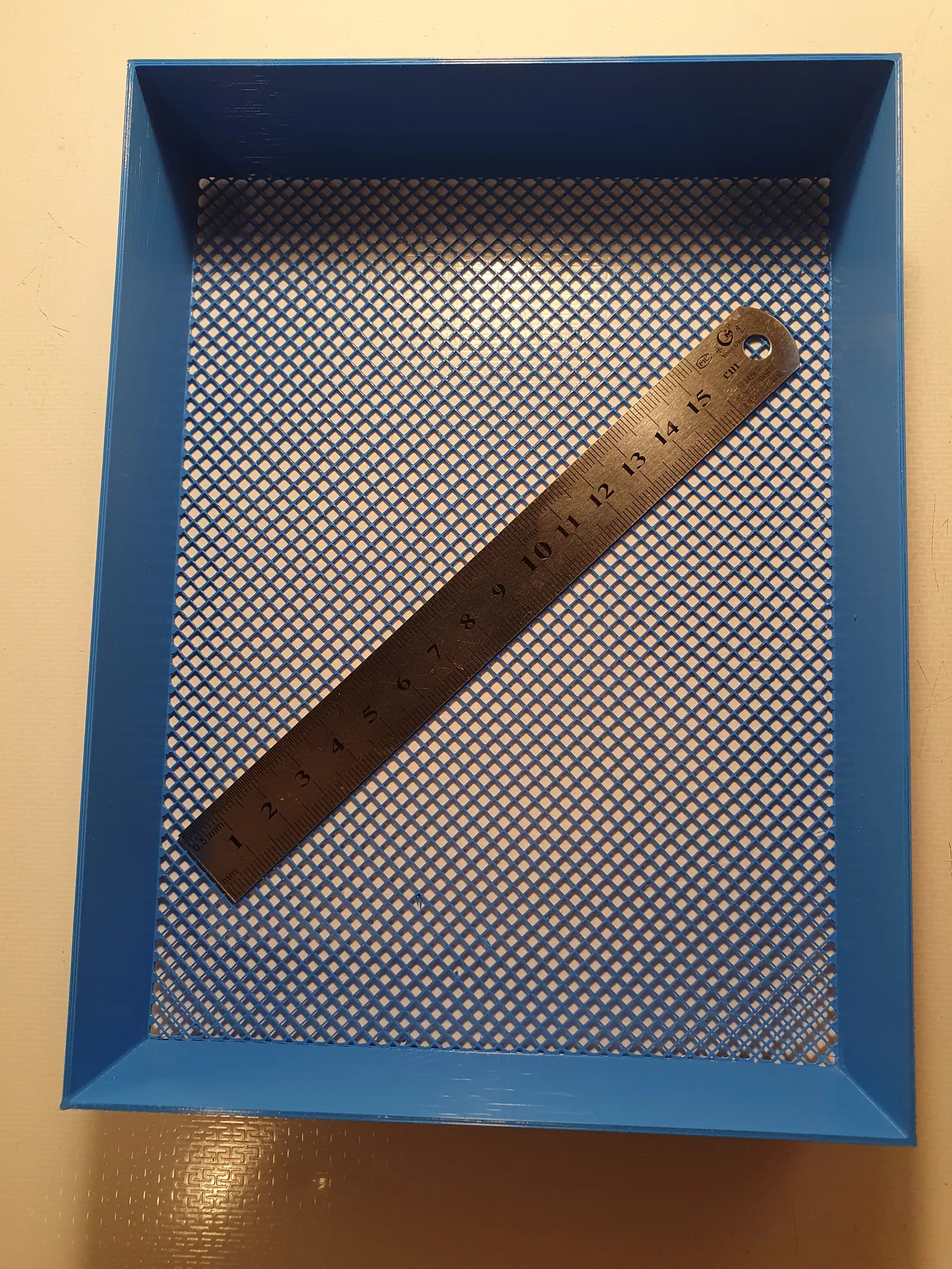 Một khái niệm rây có thể in được. Kích thước 150x200x40mm, sử dụng hoa văn infill có thể cấu hình để tự tạo ra các lỗ. Thiết kế này tận dụng tính năng của PrusaSlicer để tạo lưới sàng lọc theo ý muốn.