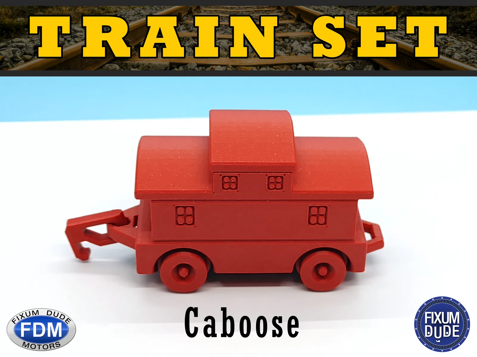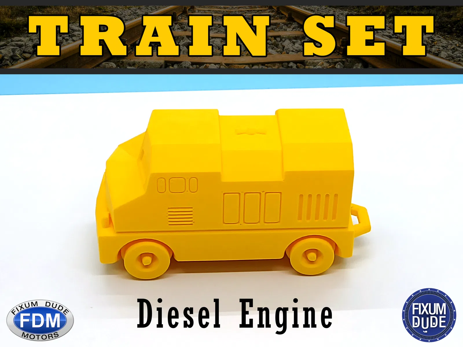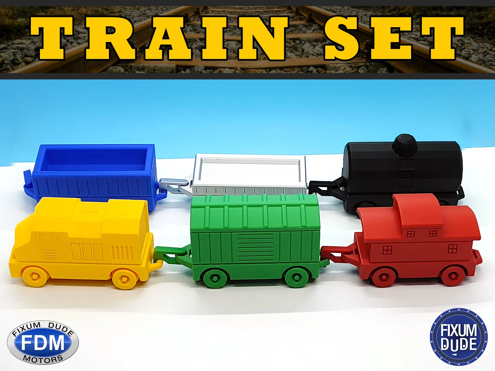 Bộ tàu diesel "in tại chỗ" Fixum Dude Motors gồm đầu máy và 5 toa xe. In không cần support, bánh xe và móc nối chạy được ngay. Thích hợp làm đồ chơi cho bé, in cùng nhau tạo nên một đoàn tàu vui nhộn.