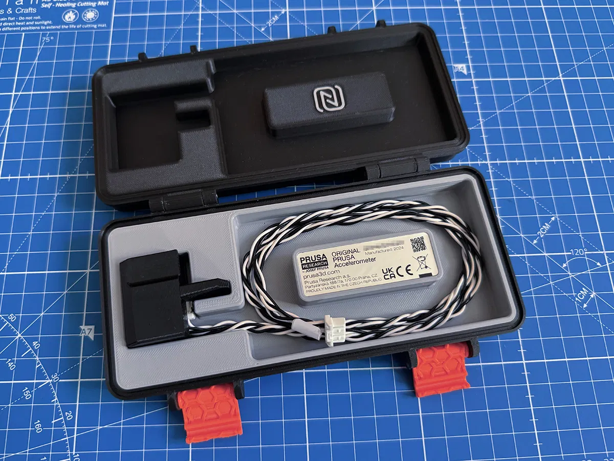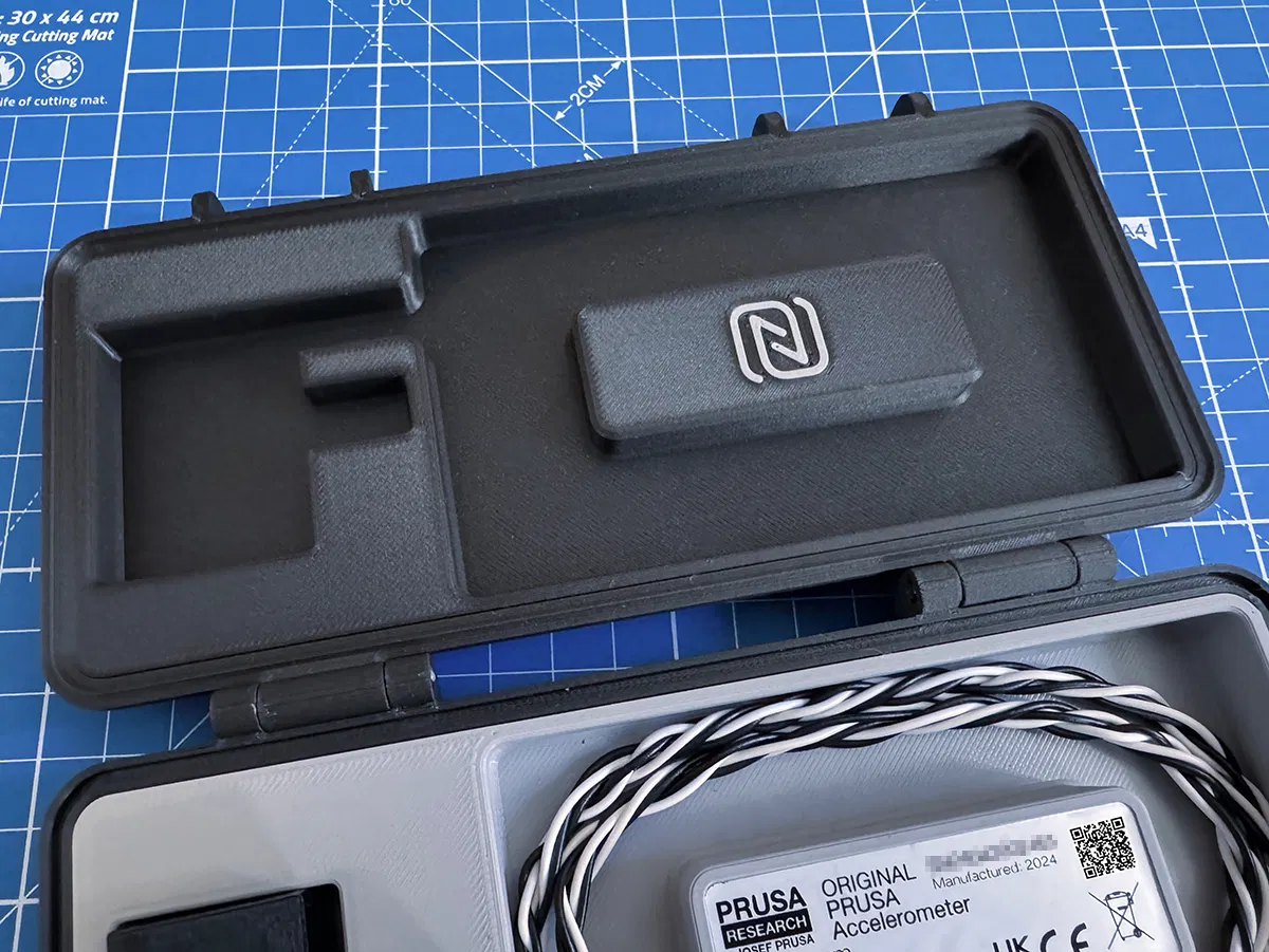 Hộp đựng PRUSA Accelerometer, dựa trên mẫu Rugged Box phổ biến. Có phiên bản tùy chọn gắn NFC tag để lưu link hướng dẫn sử dụng. Nhiều tùy biến về nắp, đế và khóa để phù hợp nhu cầu.