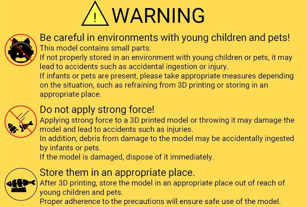Việc dùng lực mạnh tác động lên mô hình 3D in hoặc ném nó có thể làm hỏng mô hình và dẫn đến tai nạn như bị thương.