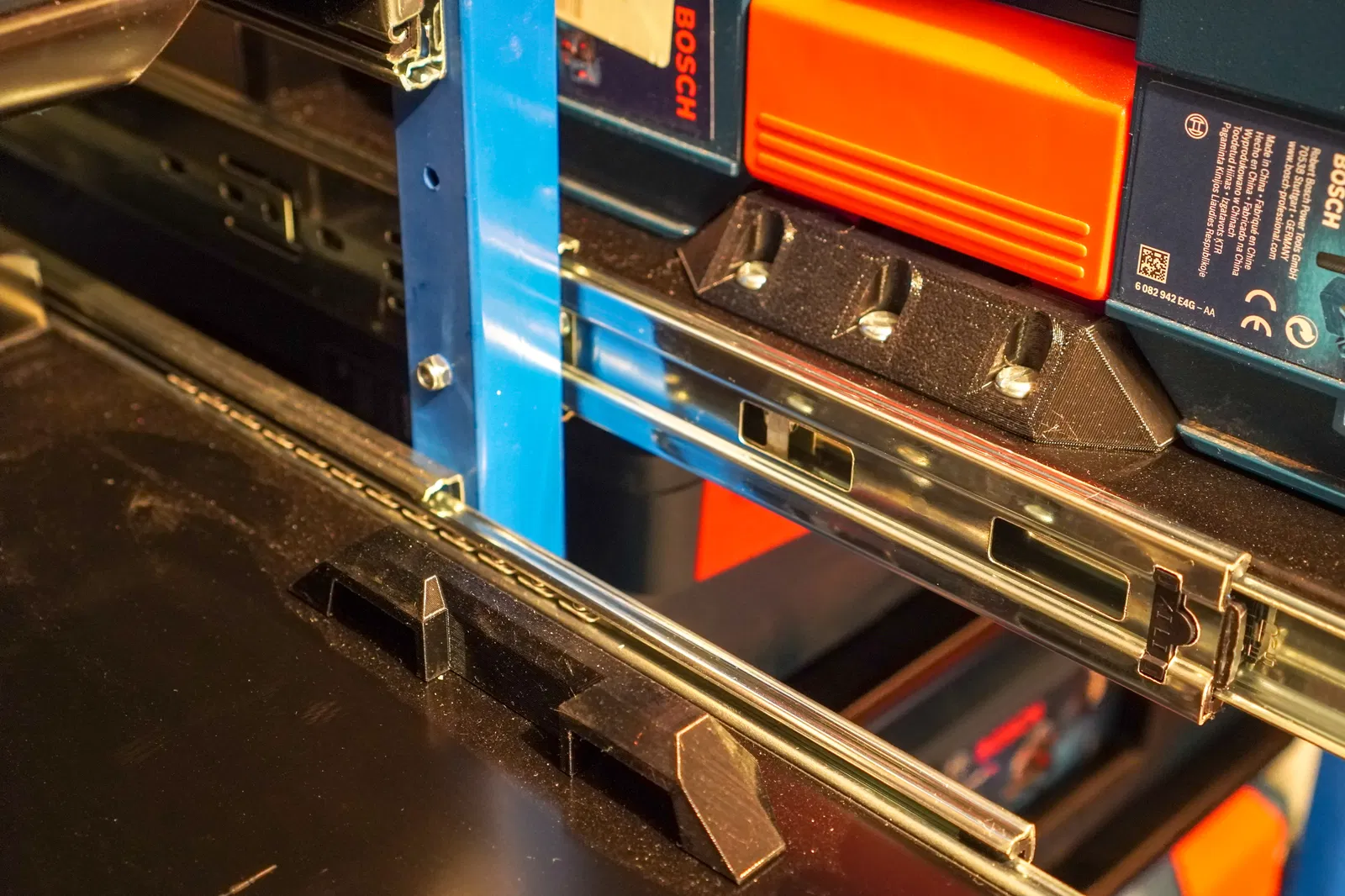 Giá đỡ tùy chỉnh cho hộp Sortimo L-BOXX, loại mà Bosch Professional dùng cho máy khoan pin. Giúp cố định hộp trên xe hơi hoặc kệ gara. Có file thiết kế và file gốc .3dm, .stp. In không cần support.