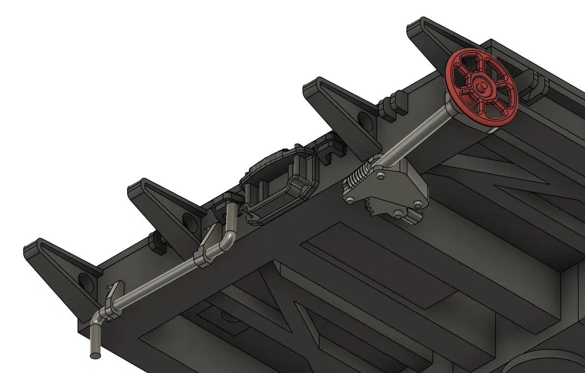 Các mô hình được thiết kế cho in resin quang trùng hợp (photopolymer resin printing). Các bộ phận của hệ thống phanh có lỗ 0.5mm để luồn dây kim loại giả ống dẫn và thanh nối.