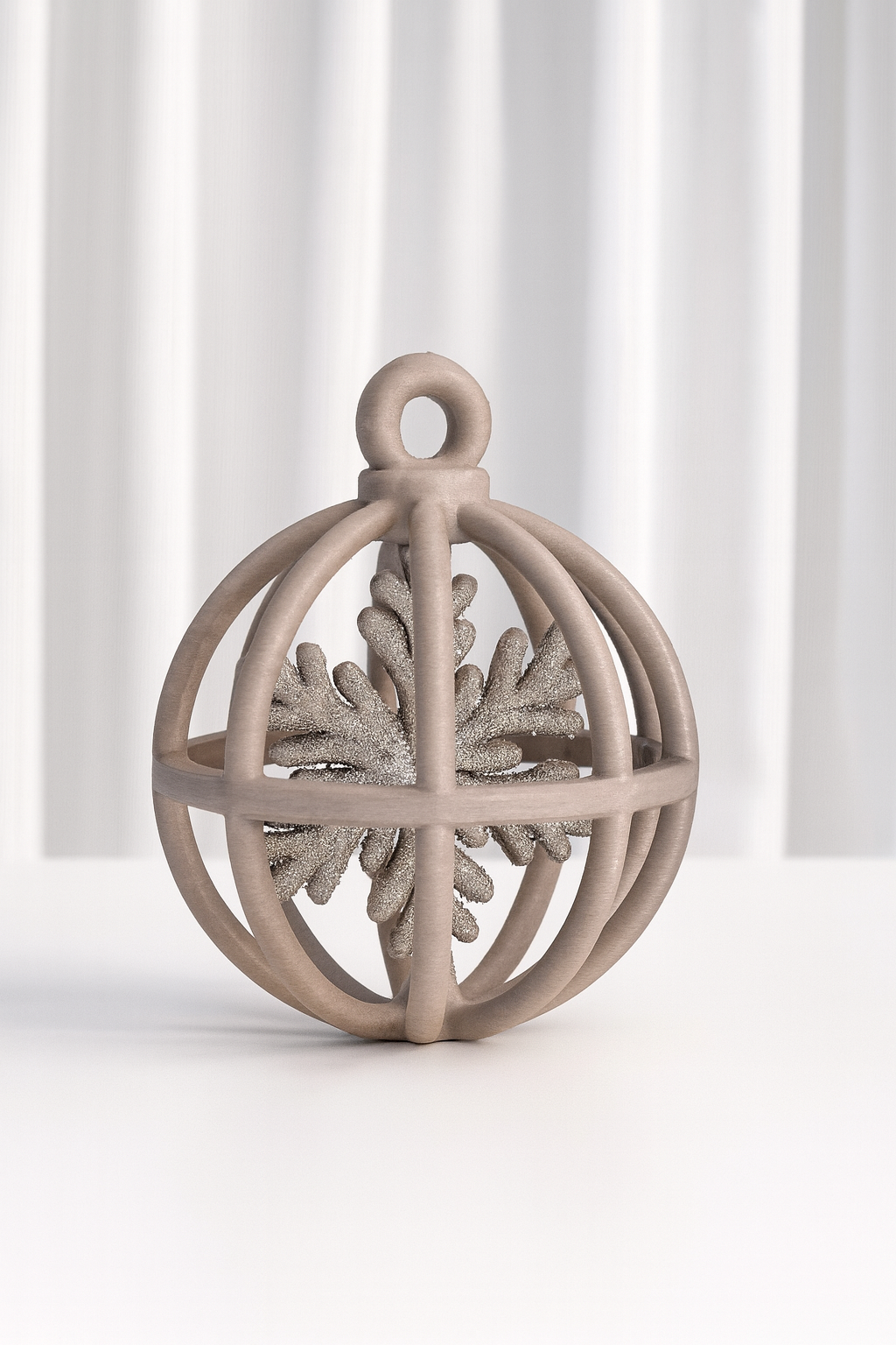Cái quả châu Noel in 3D này có thiết kế hình cầu, khung hở được làm từ sợi nhựa mờ mịn. Cấu trúc gồm các thanh nan đều nhau tạo thành hình khối cầu, bên trong là một bông tuyết trung tâm được tạo hình tinh xảo. Họa tiết chi tiết của bông tuyết tạo sự tương phản nhẹ nhàng với các đường nét hình học gọn gàng của lồng bên ngoài, tạo nên sự pha trộn hài hòa giữa thiết kế hiện đại và nét đẹp lễ hội.
