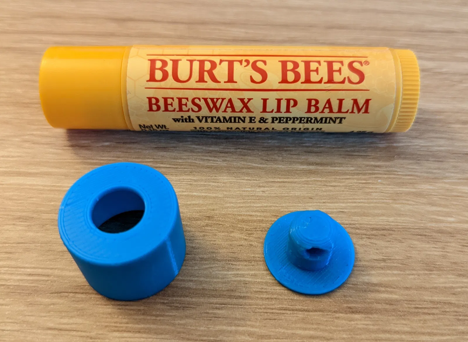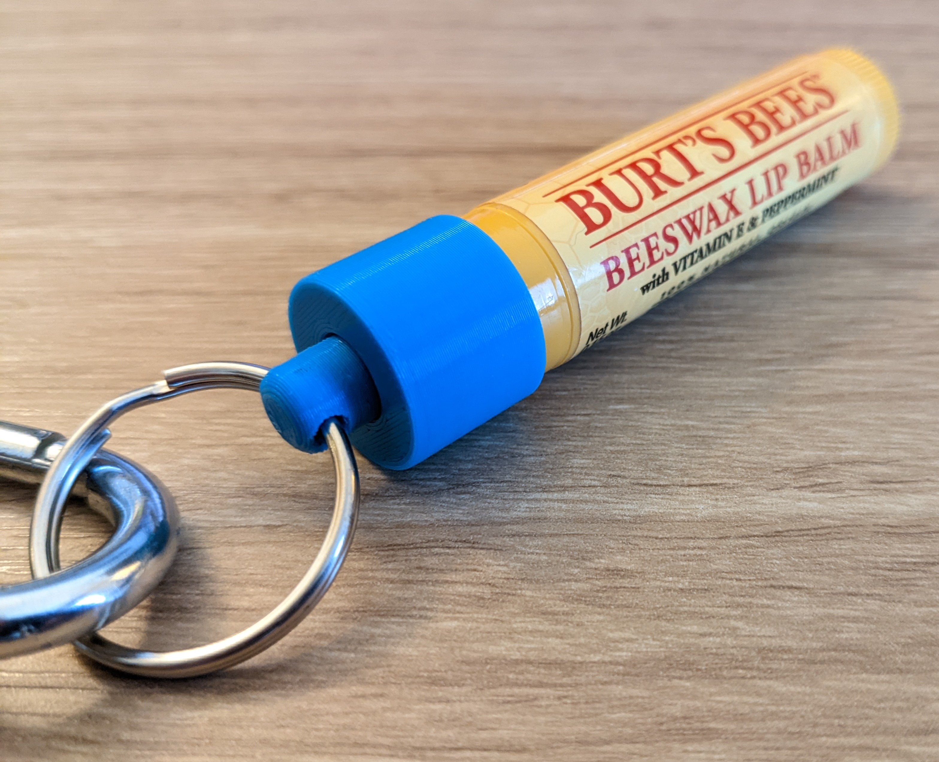 Mẫu thiết kế hai phần đơn giản để gắn thỏi son dưỡng môi Burt's Bees vào móc chìa khóa. Phần nắp phía trên cho phép đẩy thỏi son ra ngoài dễ dàng. Có thể điều chỉnh kích thước cho phù hợp với nhiều loại son.
