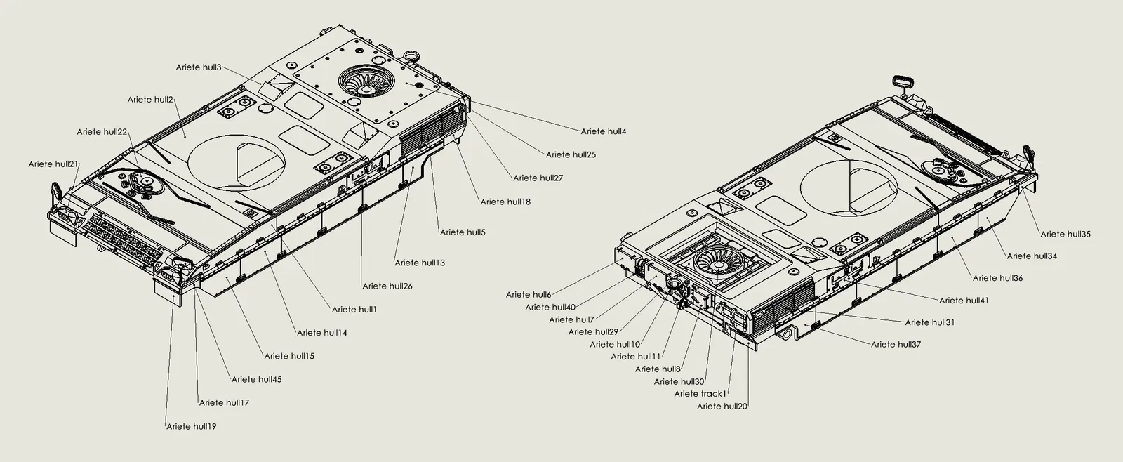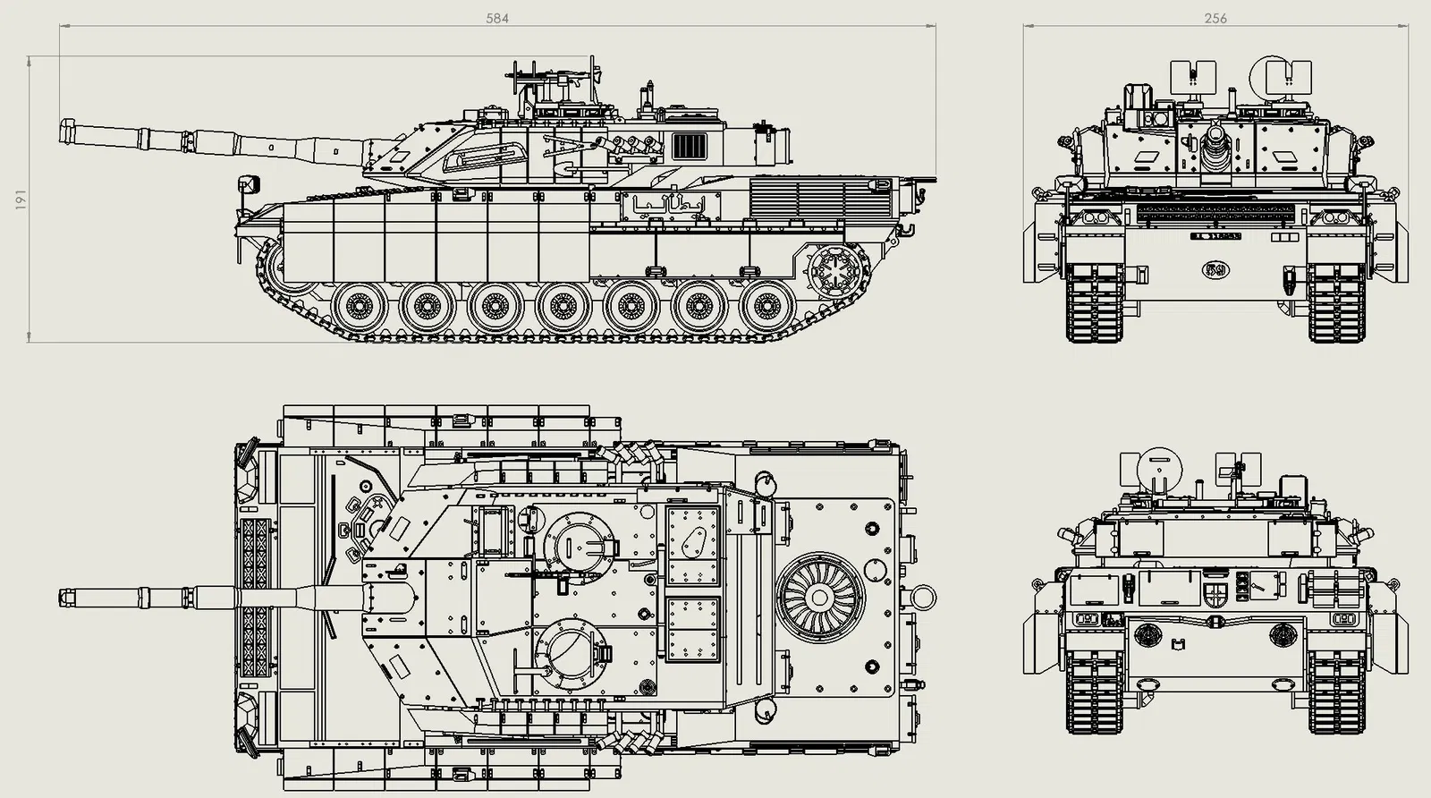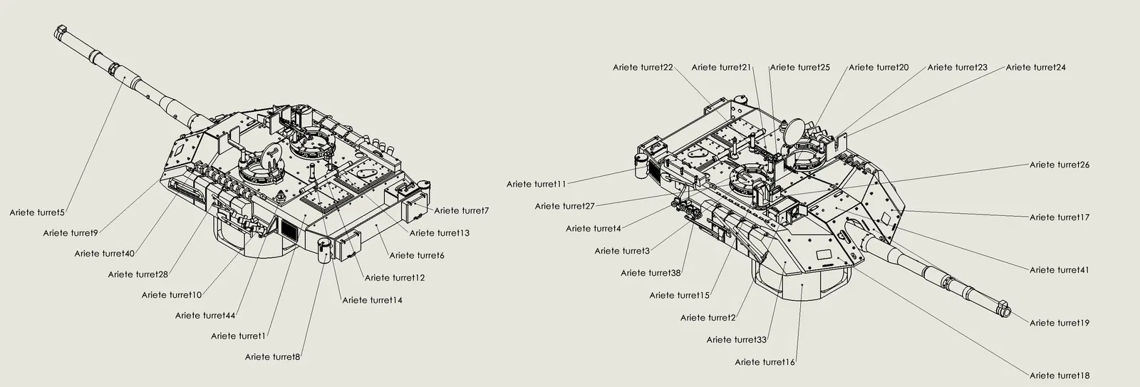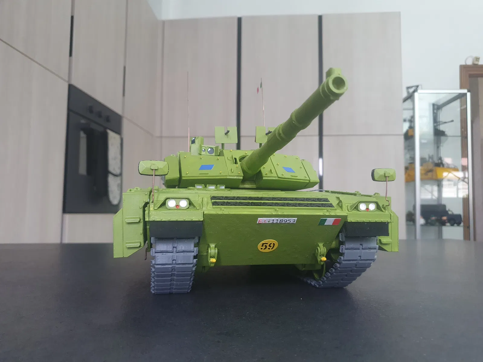 Mô hình xe tăng chiến đấu chủ lực C1 Ariete của Ý, dài khoảng 600mm. Mô hình in hoàn toàn bằng PLA, với các bộ phận có thể xoay, lắc lư và bánh xích trượt tự do. Cần thêm vít, đai ốc và dây kim loại để hoàn thiện.