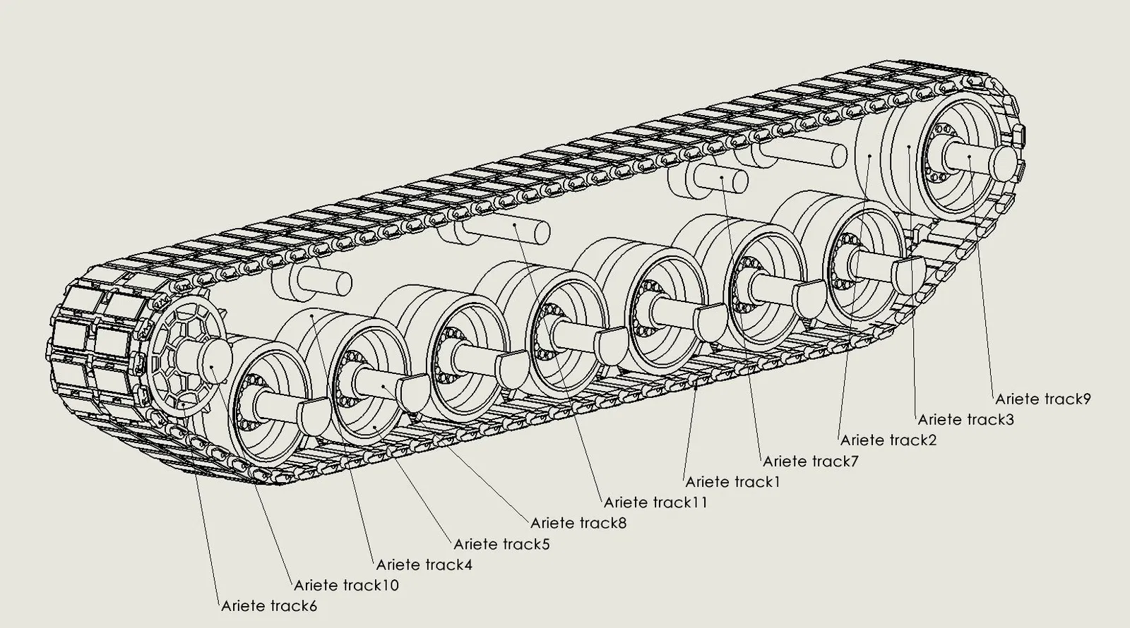 Các bánh xích có thể trượt tự do nhờ các chốt dẫn động và hệ thống căng xích ở trục sau. Ngoài nhựa, bạn sẽ cần một vít M5X20 và một đai ốc M5 cùng khoảng 7m dây sắt Ø1mm để nối các mắt xích và các tấm chắn bên cũng như các chốt cửa sập.