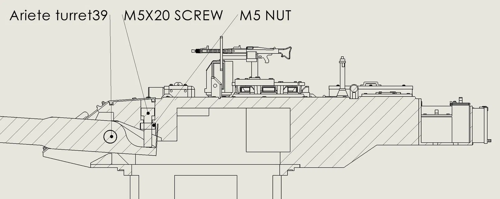 Tháp pháo có thể xoay và nòng pháo có thể lắc lư (cuối cùng có thể giữ ở vị trí trưng bày bằng hệ thống vít).