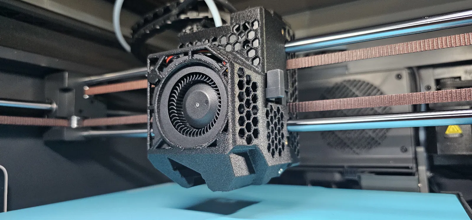 - Các tấm dạng khung xương và lỗ thông gió được tạo ra, loại bỏ các phần không cần thiết phía trên quạt để phân bổ trọng lượng tốt hơn, hầu hết trọng lượng giờ đây nằm phía sau quạt. Điều này dịch chuyển trọng tâm về phía các thanh dẫn hướng và tâm trọng lực của toolhead để kiểm soát quán tính tốt hơn.