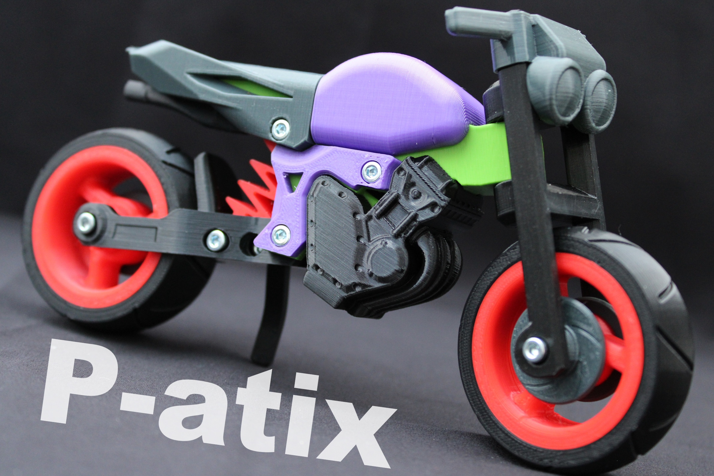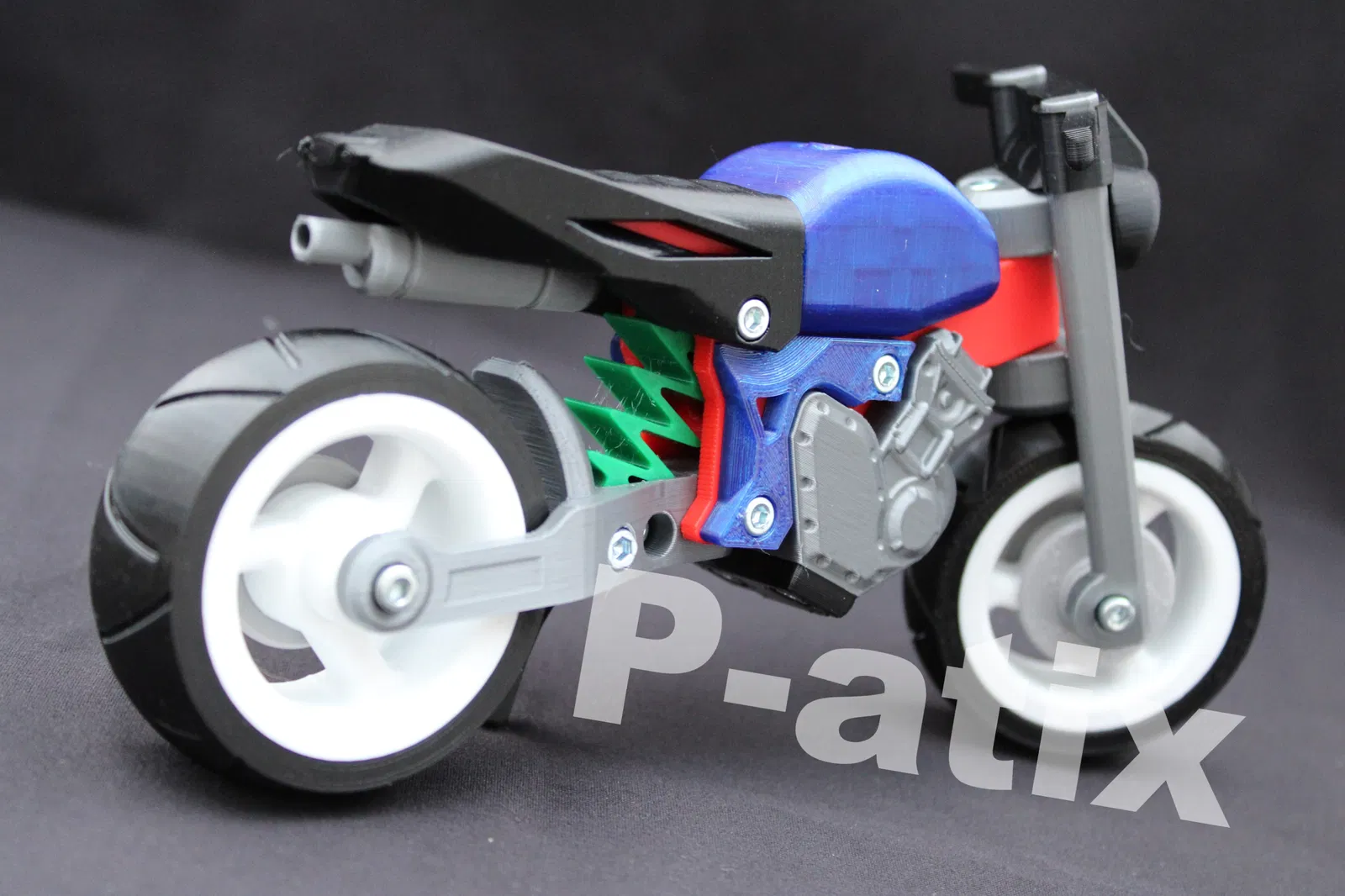 Mô hình xe Naked Stunt Bike, tỉ lệ khoảng 1:10. Đây là sản phẩm do mình tự tạo ra, không dựa trên bất kỳ mẫu xe mô tô thực tế nào. Mô hình gồm 21 bộ phận, được thiết kế để in dễ dàng mà không cần đến support.