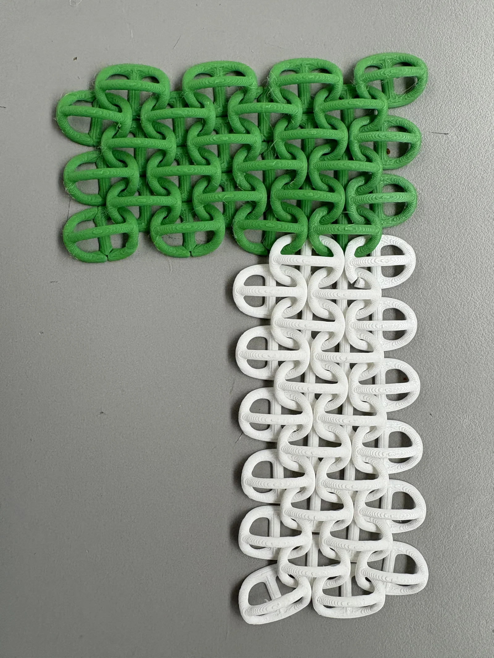 Mỗi chi tiết trong thiết kế này có hai loại cầu nối: một cặp ở hai đầu dài, và một cầu nối ngang duy nhất nối mấy cái cầu đó lại để tránh bị rối. Tụi mình nhận thấy là mấy cái cầu nối đầu tiên cứ hay bị lỗi hoài nếu cái module cơ bản hình vuông — khoảng cách nó xa quá với khả năng dính đế in hạn chế. Thay đổi tỉ lệ giúp giảm chiều dài cầu nối và cho nó có cơ hội thành công. Cầu nối ngang thì không ngại dài hơn vì mấy cái phần bên dưới đã dính đế in tốt hơn khi in tới đó.
