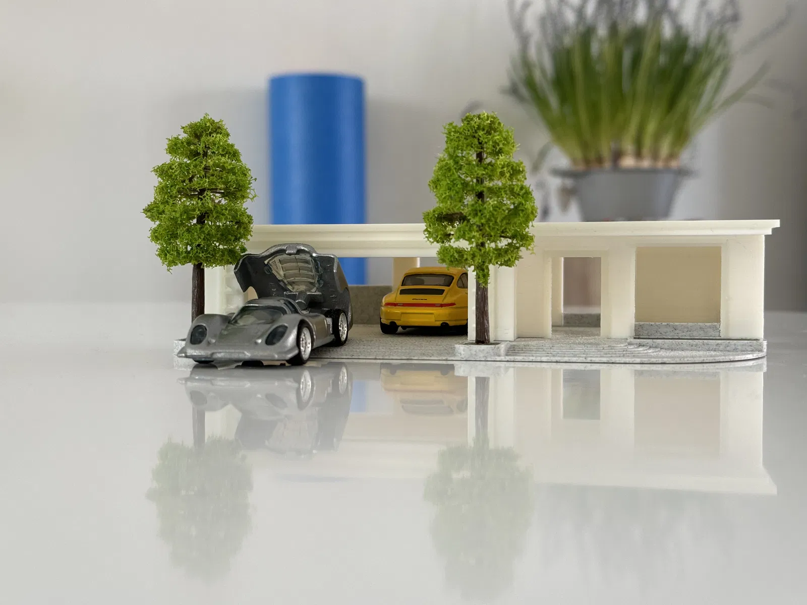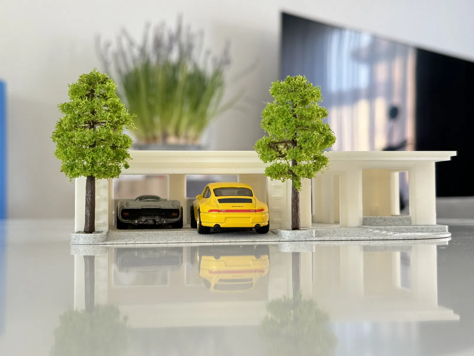 Một ngôi nhà nhỏ tỉ lệ 1:64 với gara đôi có thể chứa hai xe mô hình, thiết kế dual extrusion. Phù hợp cho xe HotWheels, MiniGT, Tomica, Matchbox, v.v. Có thể trang trí kệ hoặc bàn làm việc.