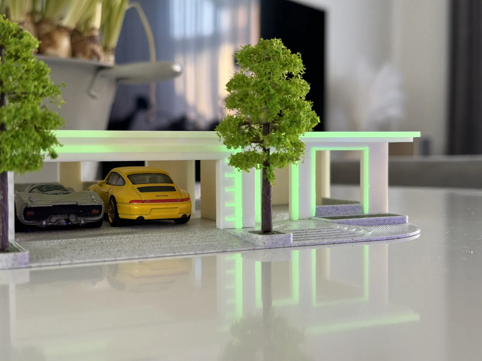 Thêm một dự án vui vẻ ở tỉ lệ 1:64, một mô hình nhà nhỏ có gara đôi chứa được hai xe HotWheels, Tomica, Matchbox, MiniGT và các mẫu xe mô hình tỉ lệ 1:64 khác. Tôi đã thiết kế cái này với mục đích dual extrusion và in của tôi để có những chi tiết mỏng màu "glow in the dark" bằng PLA. Bạn có thể thử nghiệm với các màu khác để tìm ra sự kết hợp của riêng mình. Tôi đã dán hai cây cảnh mini để làm cho nó thêm phần sinh động. Phần đế cũng có hai màu, và tôi đã in của mình màu xanh ô liu để làm các khu vực "đất" nơi có lỗ trồng cây.