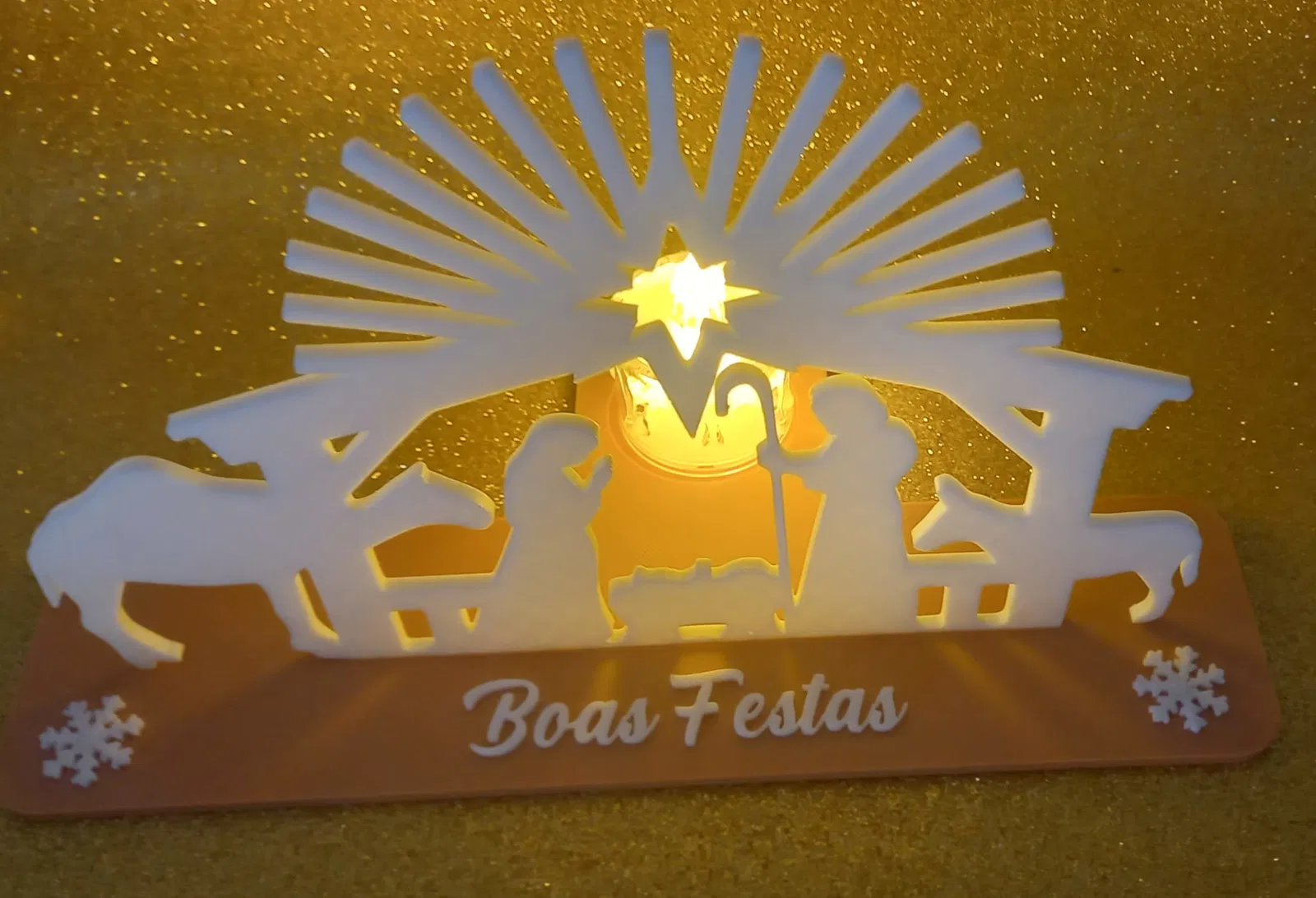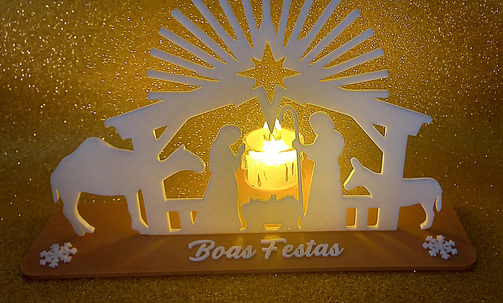 Hình bóng của một hang đá Giáng sinh, được tạo trên Tinkercad, có ưu điểm là bạn có thể tùy chỉnh phần mô tả trên đế theo ý thích, còn có chỗ để đặt nến trà (tea light).
