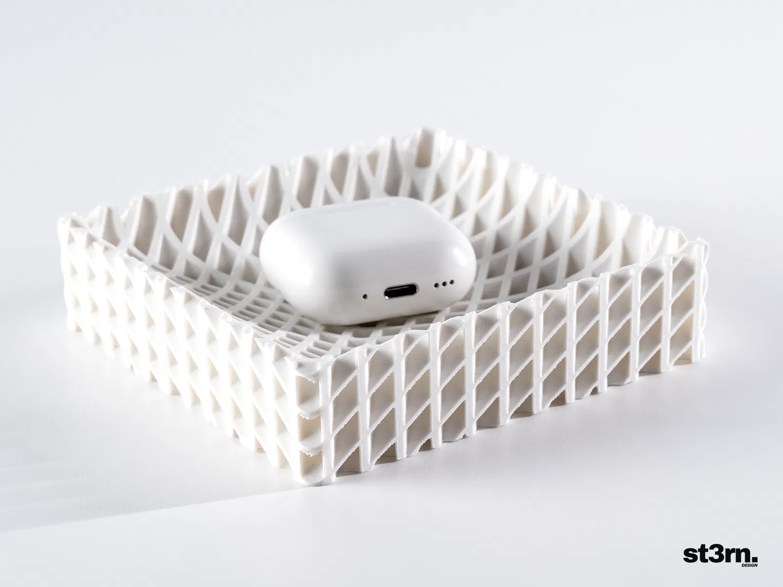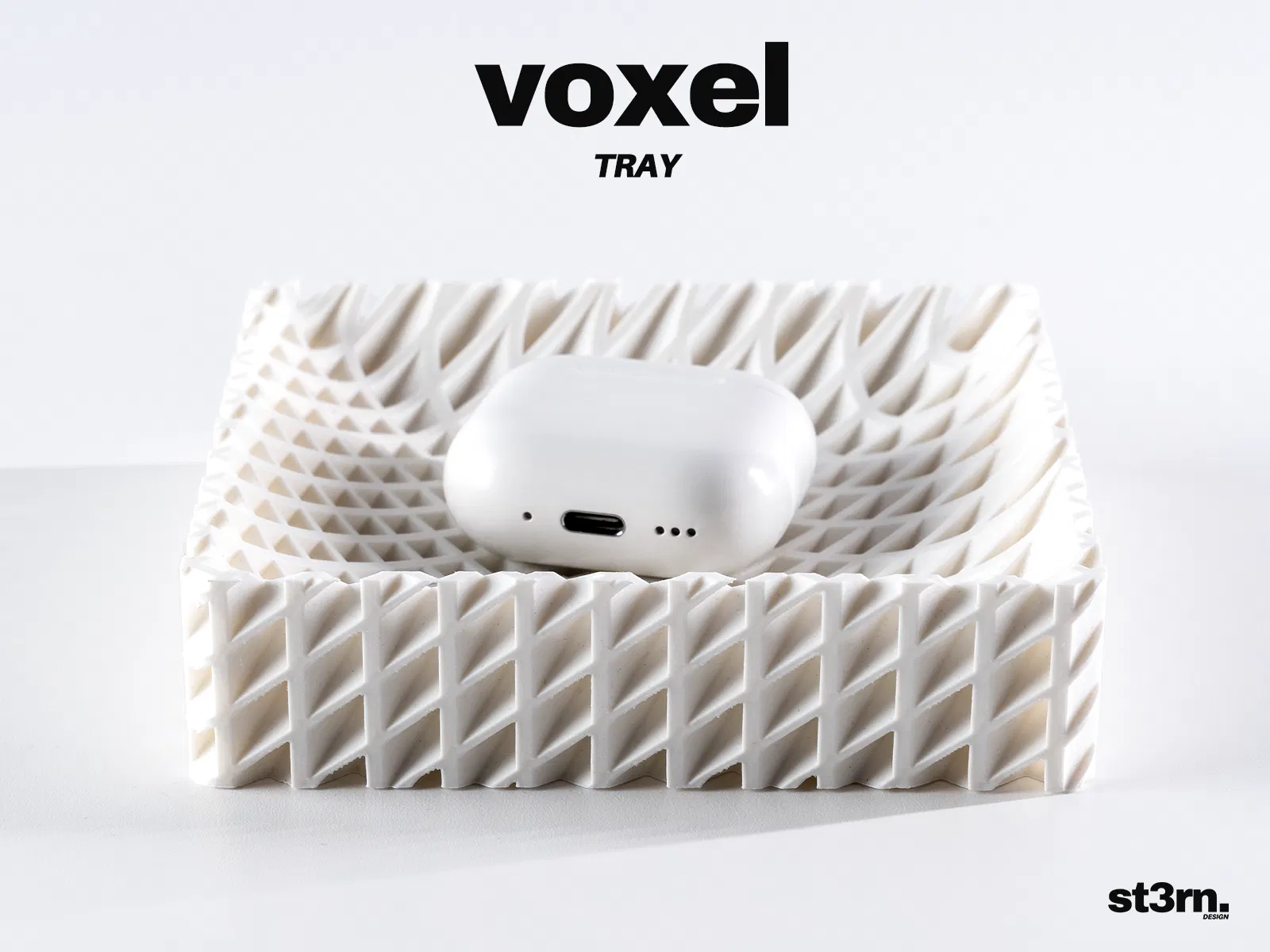 Chiếc khay đựng đồ độc đáo với họa tiết lưới voxel tạo ảo ảnh thị giác, kích thước 120x120x30 mm. Thích hợp làm hộp đựng remote, chìa khóa, AirPods. Thông tin in ấn và liên kết hỗ trợ.
