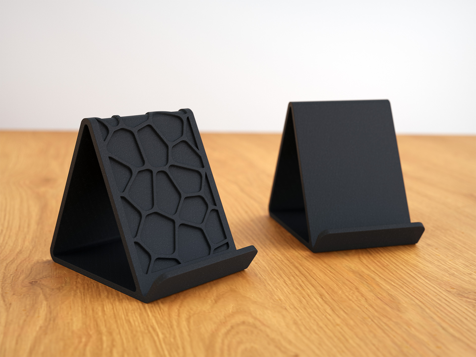 Hai mẫu đế điện thoại đẹp mắt, một kiểu có hoa văn Voronoi và một kiểu trơn, đều có thể in 3D mà không cần vật liệu hỗ trợ. Ủng hộ người tạo mẫu qua liên kết AliExpress nếu bạn thích nhé!