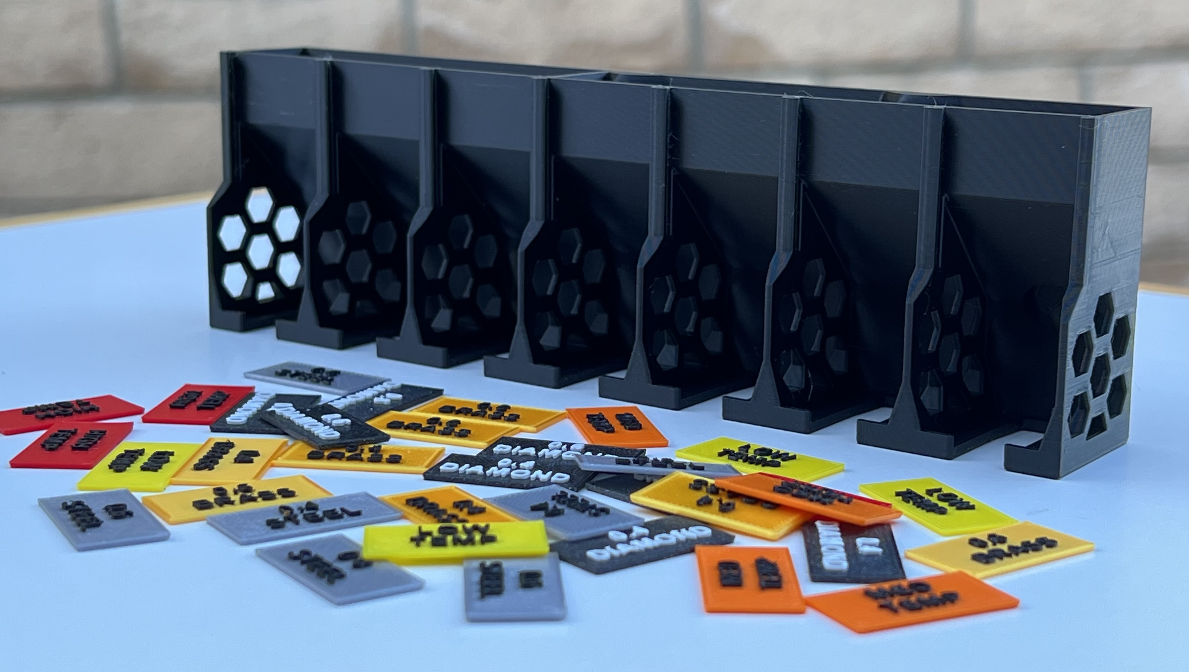- Định hướng giá đỡ trên bàn in với các khe cắm khối gia nhiệt hướng xuống (trên bàn in) và các khay lưu trữ phía trên. In với độ cao lớp 0.2 mm bằng vòi phun 0.4 mm; không cần hỗ trợ.