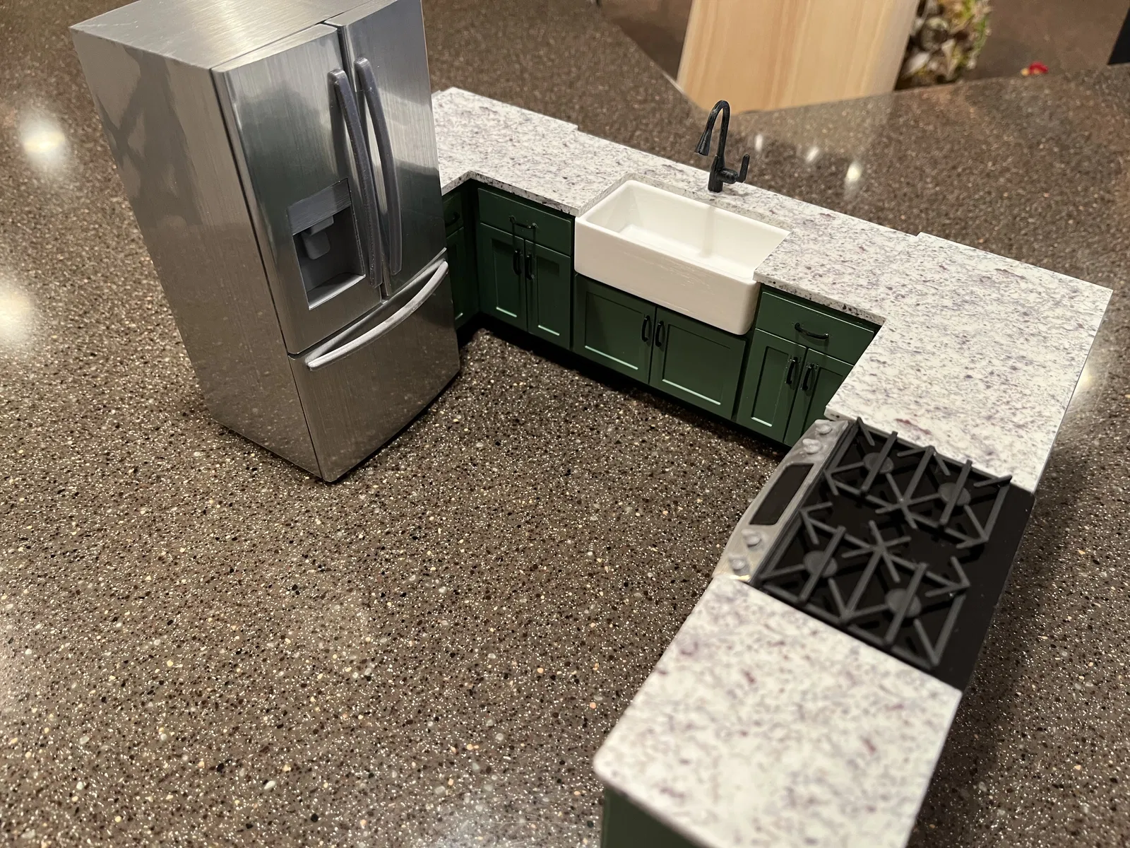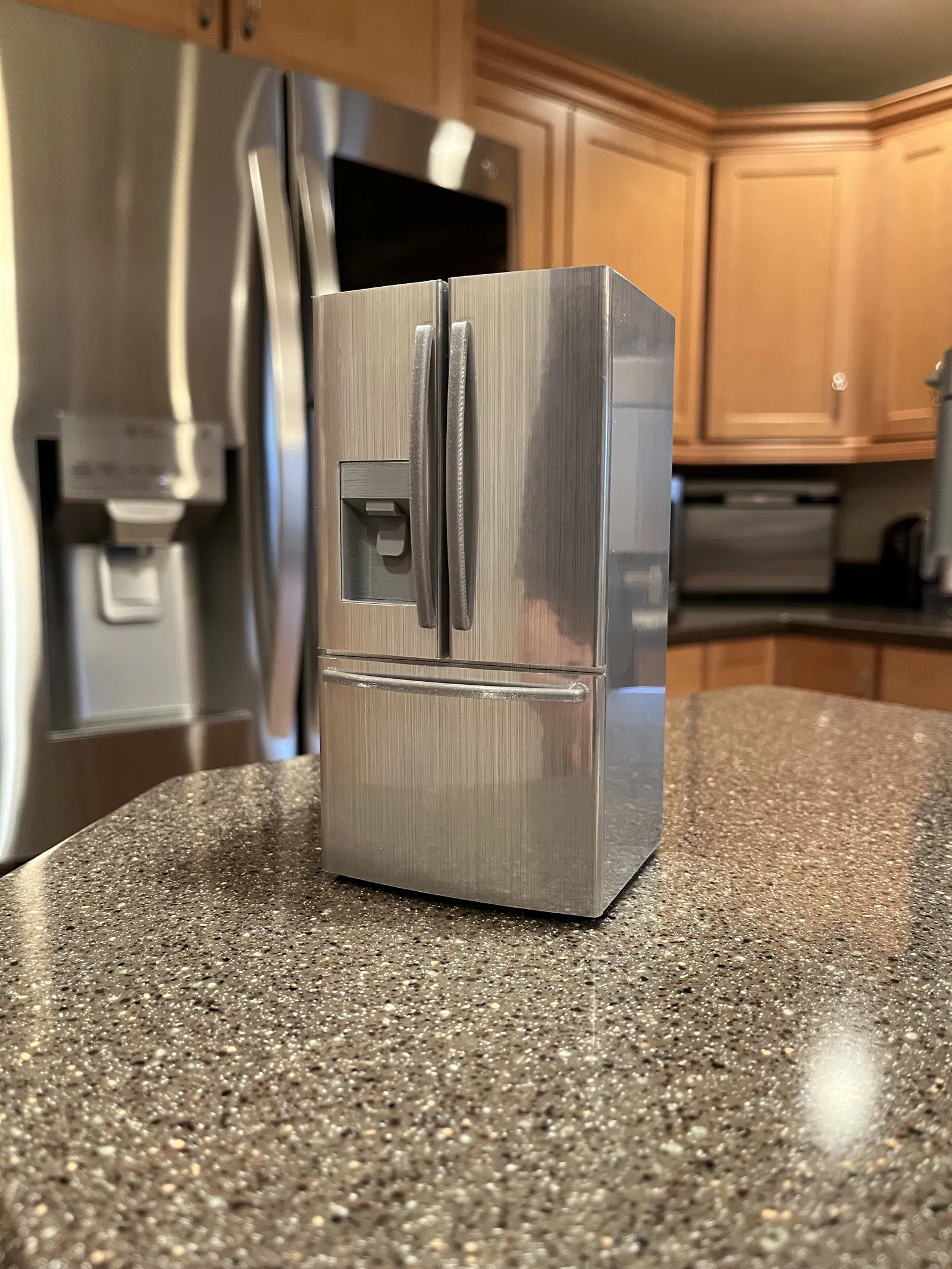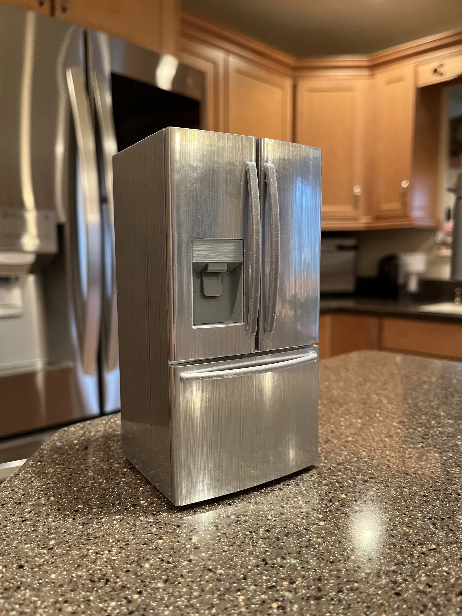 Cái mô hình này chỉ để trưng cho đẹp thôi chứ không có chức năng gì đâu nha. Mấy bộ phận đều được in riêng rồi dán lại với nhau hết trơn á. Tui có dùng miếng dán inox loại bóc ra là dán được cho cái thân với mấy cái cửa tủ. Mấy cái bộ phận in ra tui có chà nhám với làm mịn nhiều lắm để có kết quả đẹp nhất.