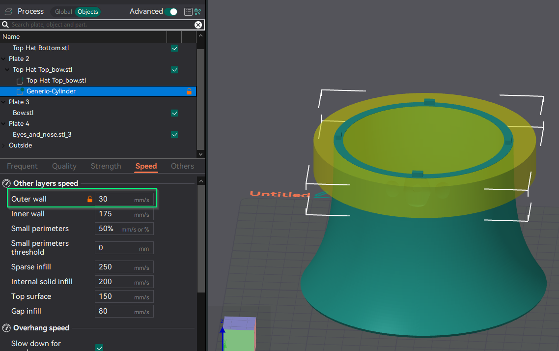 Để có được hiệu ứng "dải băng" như bạn thấy trong ảnh của mình, mình chỉ cần giảm tốc độ in ở phần đó của mũ. Nếu bạn muốn tự động thêm thay đổi này vào gcode của mình thay vì chỉnh sửa thủ công, bạn có thể làm như sau trong Orca Slicer: