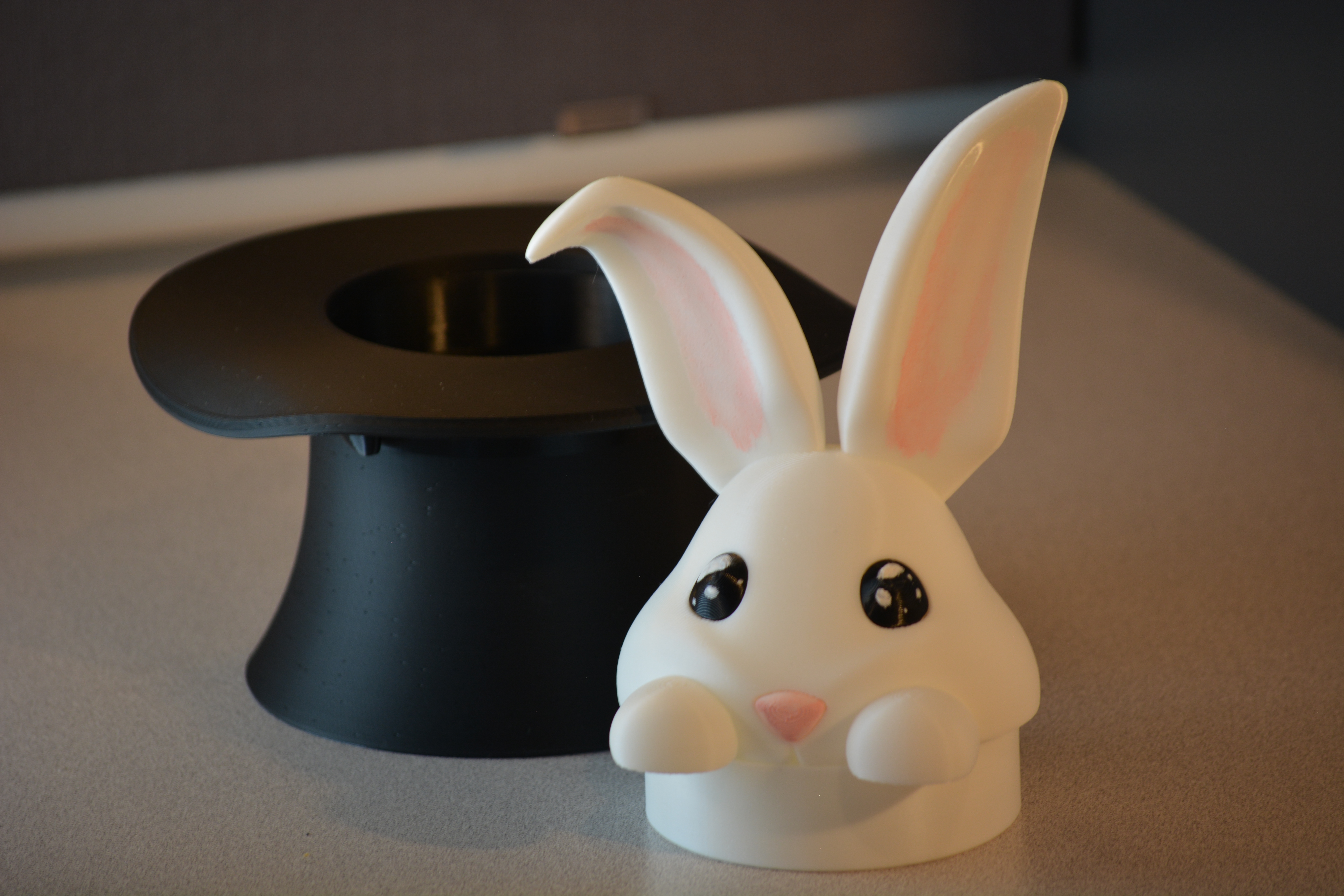 Tạo hình nón thỏ độc đáo, có thể in đơn hoặc đa vật liệu, hoạt động như một hộp đựng đồ. Hoàn hảo cho những người yêu thích ảo thuật hoặc làm quà tặng độc đáo. Có hai phiên bản in cho máy đa vật liệu và máy thông thường, cùng các tùy chọn mũ có nơ hoặc không nơ.