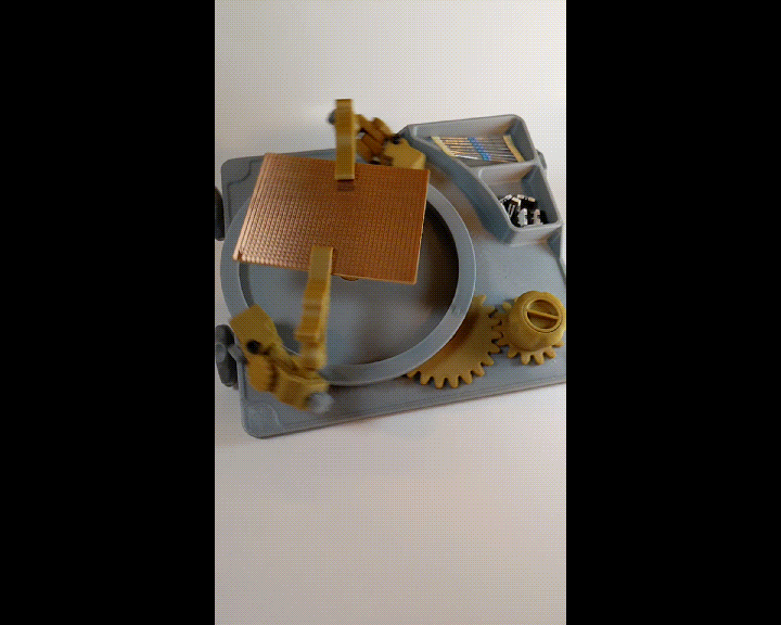 - Dán Bộ phận giữ bánh răng lớn_Dưới và Bộ phận giữ bánh răng đĩaDưới vào Khay xoay. Đẩy Bánh răng lớn qua Bộ phận giữ vào Núm bánh răng để Bánh răng lớn ăn khớp chặt hơn với Núm bánh răng trong khi keo khô. Thực hiện tương tự khi dán Đĩa vào Khay. đẩy Đĩa qua Bộ phận giữ_ để bánh răng ăn khớp chặt hơn với Bánh răng lớn cho đến khi keo khô.