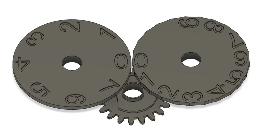 Có nhiều cách để in bánh răng chính, tôi đã có kết quả đẹp nhất bằng cách in các số trước bằng một màu lên mặt bàn in, sau đó in các bánh răng bằng một màu khác đè lên các số. Điều này có thể phụ thuộc rất nhiều vào máy in, và có thể cần thử vài lần để đạt được kết quả hoàn hảo. Tôi đã phải căn chỉnh thủ công các số với bánh răng chính trong slicer trước khi cắt lát để tránh bất kỳ sự chồng lấn nào. Sau khi in các số, tôi đã cẩn thận loại bỏ hết các sợi nhựa thừa trước khi in bánh răng lên trên.