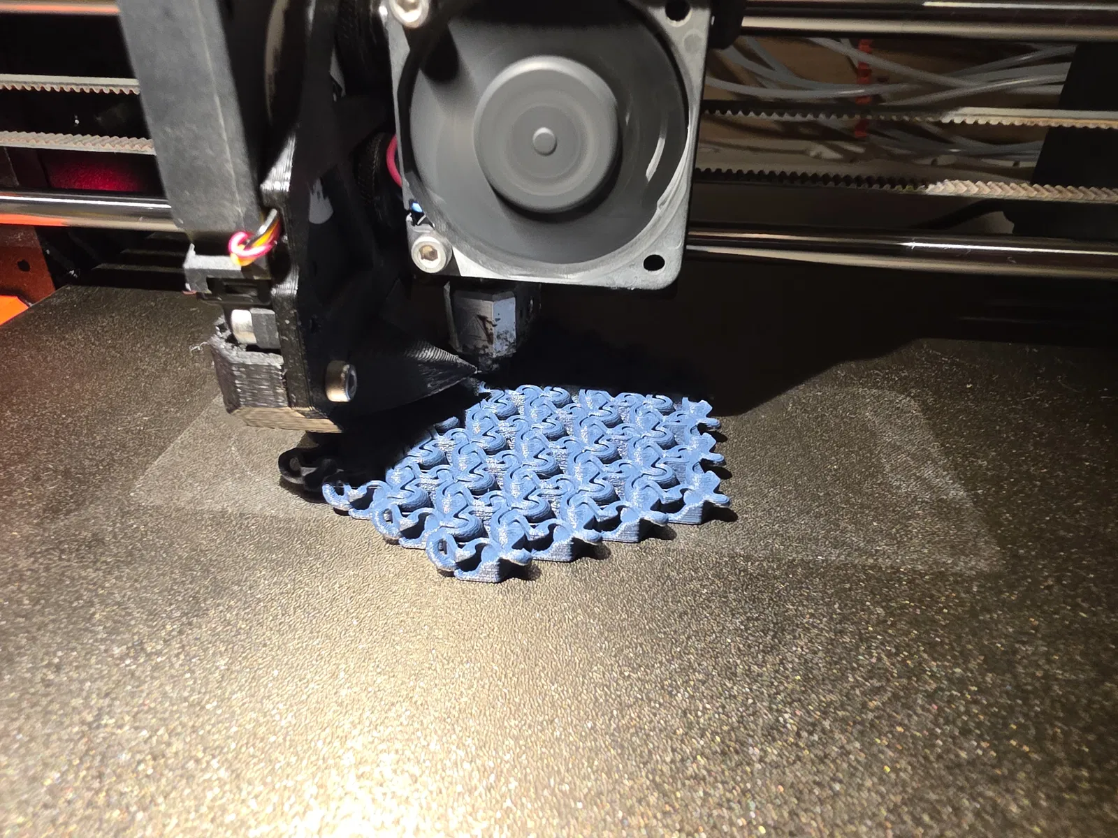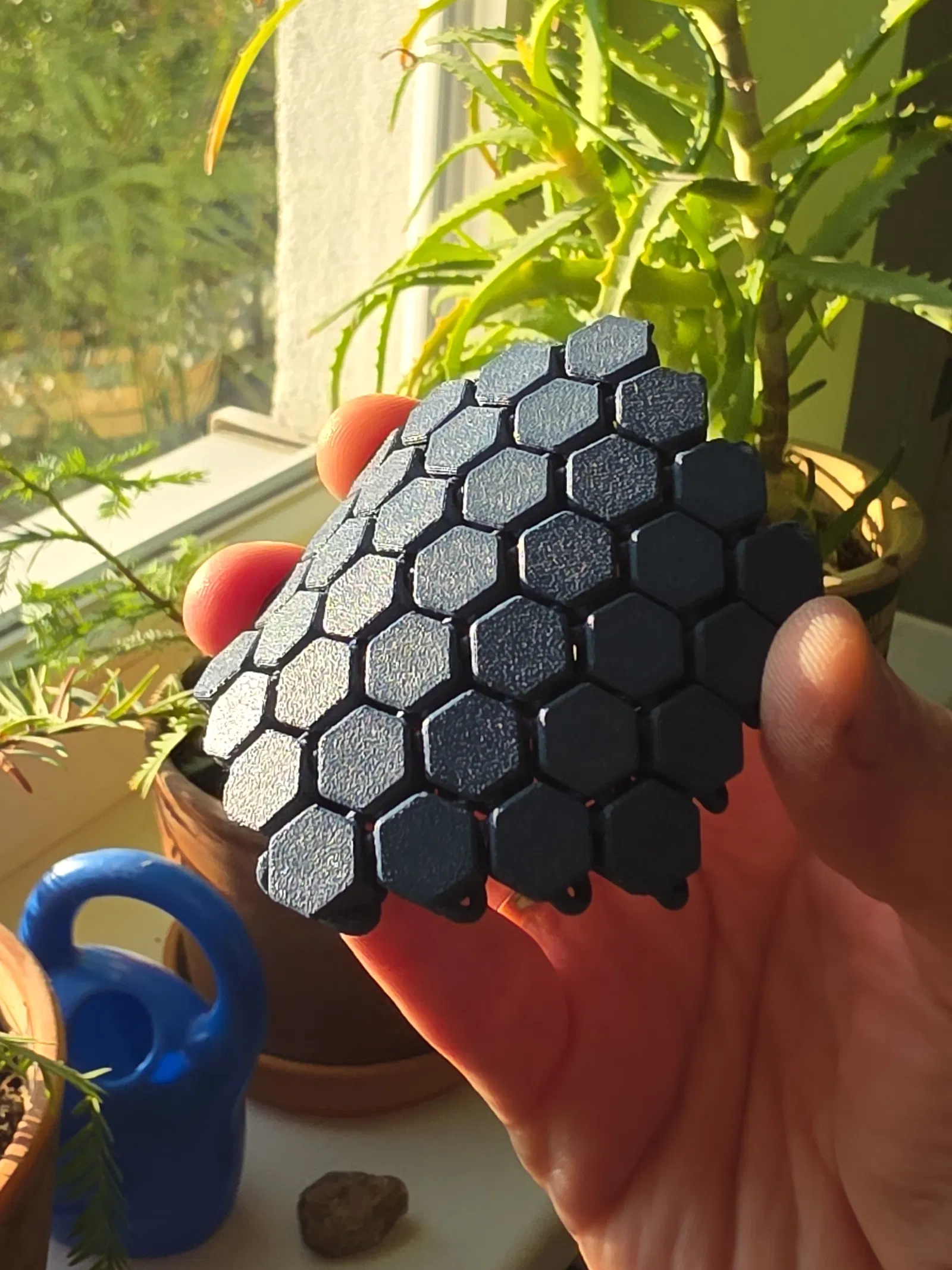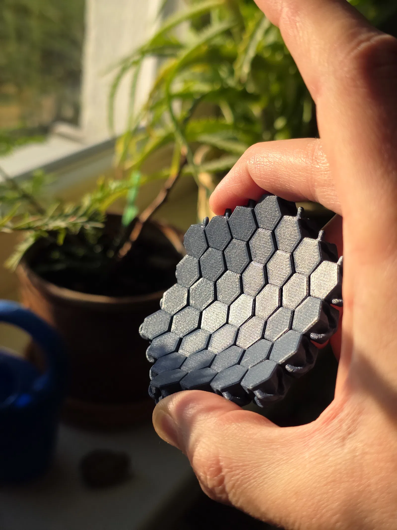 Chỉ là một cái “vải” in 3D nữa thôi, cái này có một tính năng nhỏ độc đáo. Các mảnh có thể được in nối liền với nhau (print-in-place) nhưng cũng có thể được nối với nhau sau khi in (snap-fit) - nên bạn có thể trộn màu, làm cho tấm vải dài ra tùy ý và sửa các mảnh bị hỏng. Một tính năng hay nữa là tấm vải hiển thị hình lục giác sạch sẽ ở cả hai mặt của bản in. Nó không linh hoạt lắm - tôi nghĩ bán kính uốn cong khoảng 10cm. Đây chỉ là bằng chứng về khái niệm - Dự án này rất vui và có lẽ tôi sẽ cải tiến thiết kế này trong tương lai.