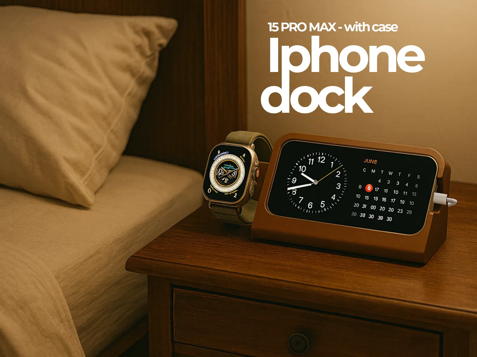 Đế sạc này được thiết kế dành riêng cho iPhone 15 Pro Max, có thể sử dụng với các ốp lưng có vòng giữ ngón tay hoặc chốt ở mặt sau. Đế có khe cắm chuyên dụng để giữ điện thoại chắc chắn, không dùng cho MagSafe.