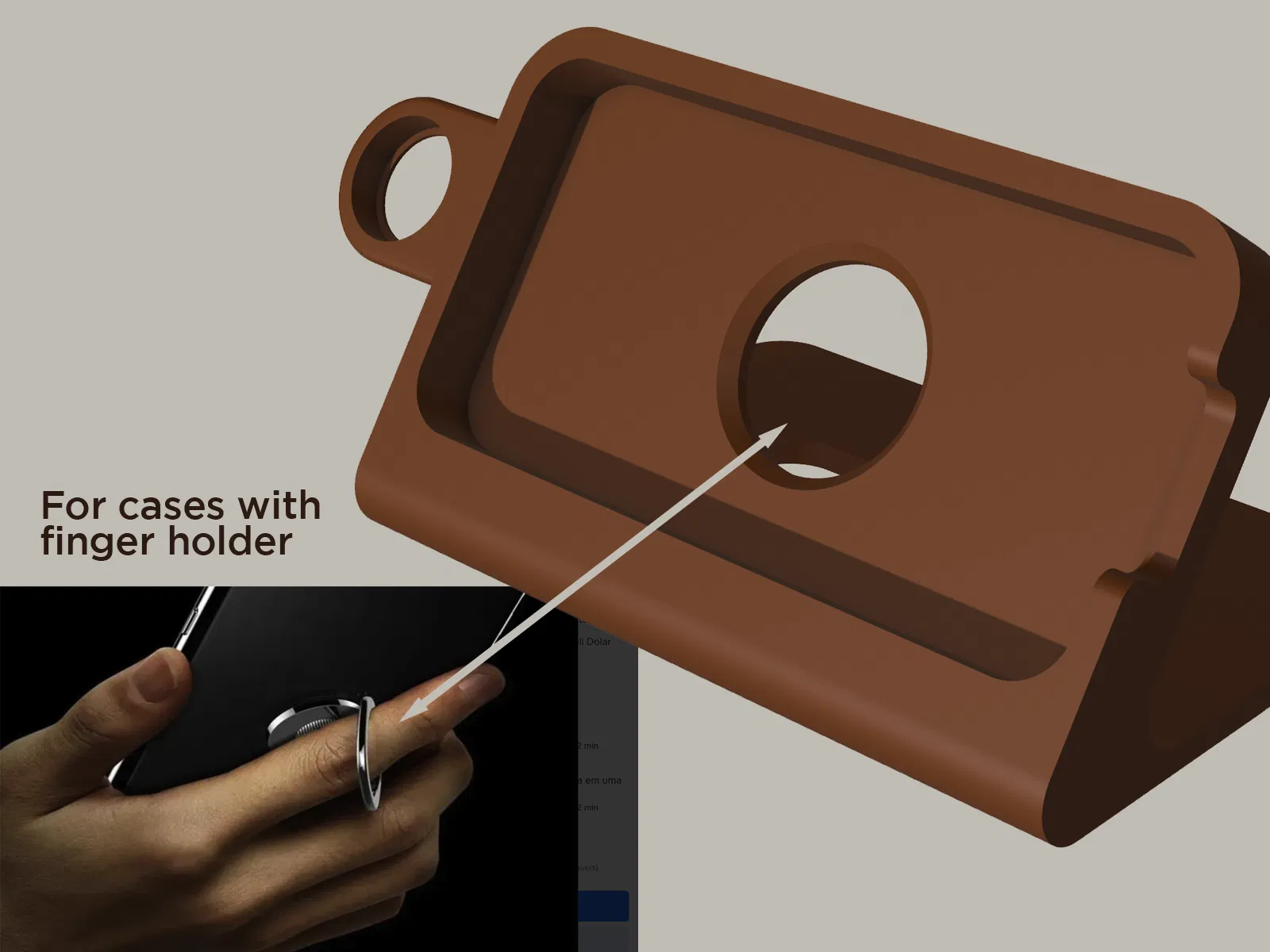 Cái đế sạc này được thiết kế đặc biệt cho iPhone 15 Pro Max, có thể dùng với các ốp lưng có tích hợp vòng giữ ngón tay hoặc chốt giữ ở mặt sau. Phần đế có một khe cắm chuyên dụng vừa vặn với loại ốp lưng này, giúp điện thoại đứng vững khi sạc hoặc khi sử dụng.