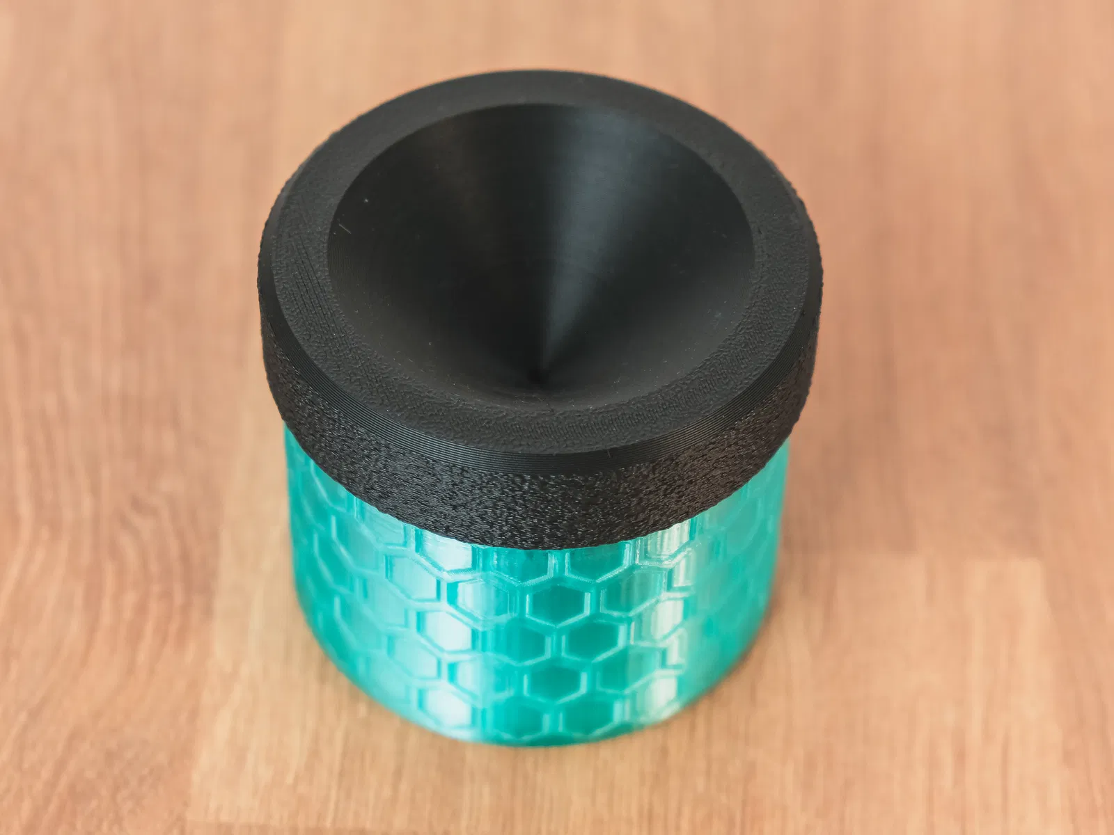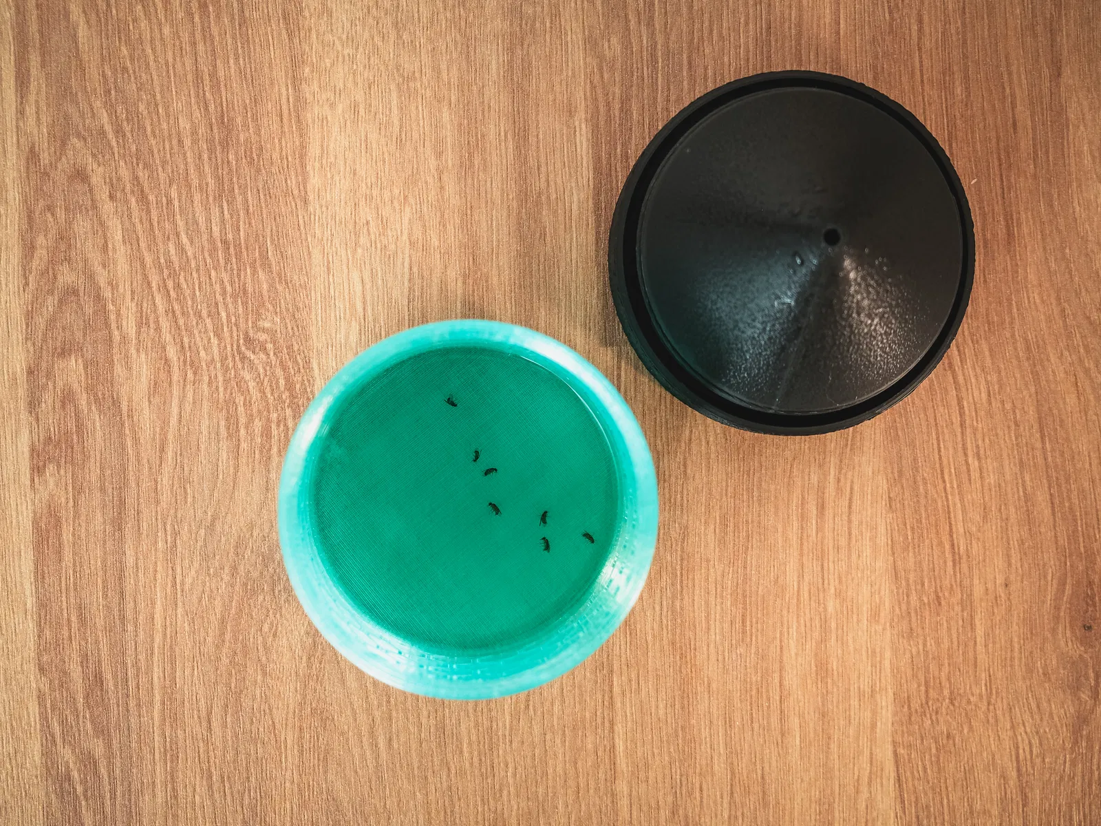 Một bẫy ruồi giấm nhỏ gọn và tiện dụng, được thiết kế để kết hợp giữa tính thực tế và phong cách hiện đại. Phần thân hộp có họa tiết lục giác bóng bẩy tạo nên vẻ ngoài hình học tinh tế, trong khi nắp đậy có vân sần giúp đậy khít và tạo cảm giác cầm nắm dễ dàng. Thiết kế này giúp giữ chặt chất dẫn dụ và ngăn ngừa đổ tràn, đồng thời đảm bảo hiệu quả bẫy ruồi.