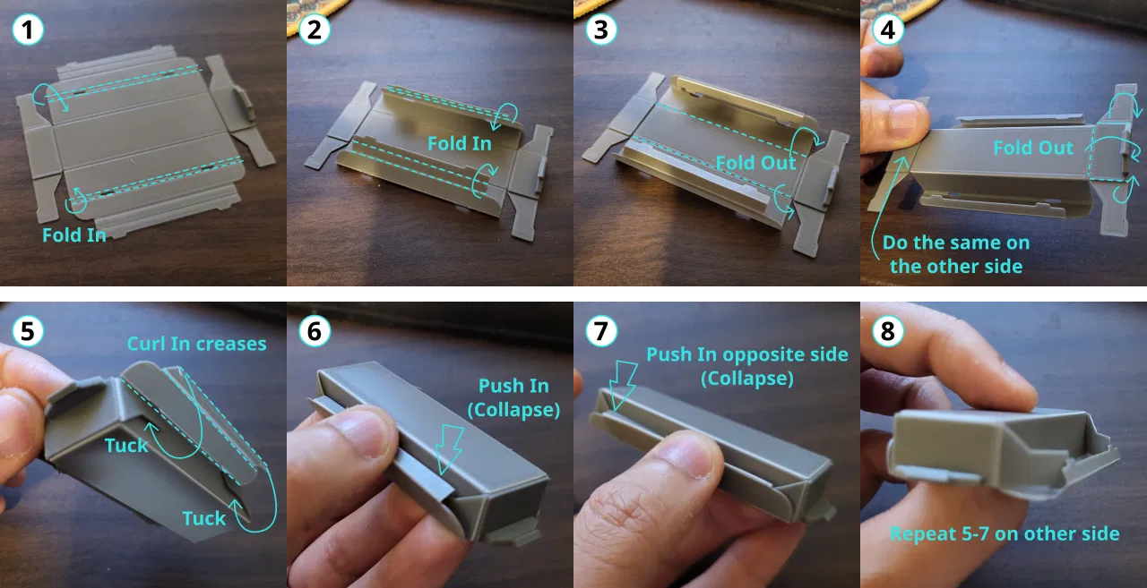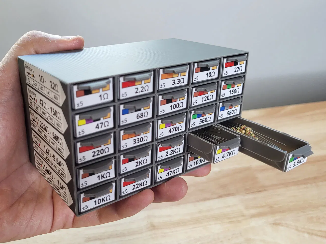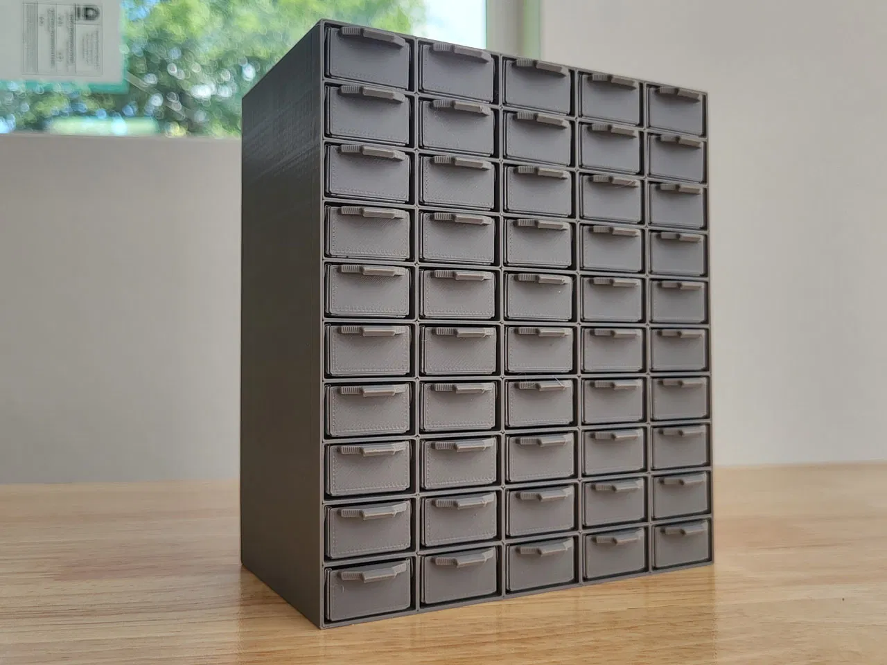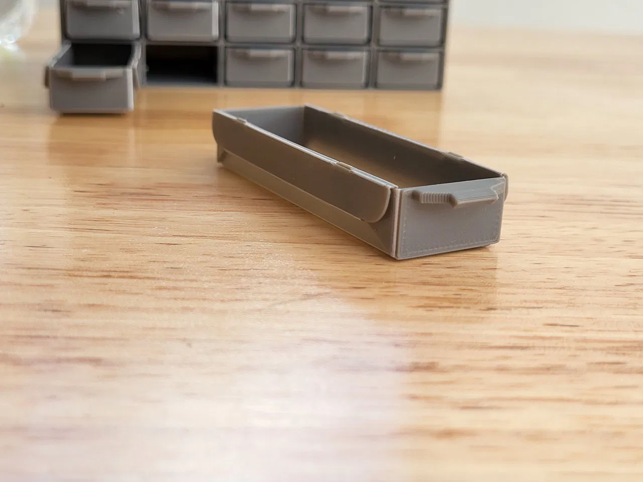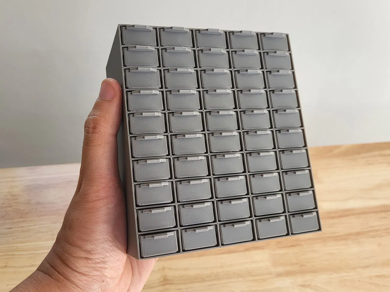 Một hộp đựng linh kiện nhỏ theo thiết kế hộp phẳng, gấp lại để lắp ráp. Tạo ra nhiều ngăn kéo nhỏ tiện lợi. Có khấc chống trượt và tay cầm độc đáo. Sản phẩm làm từ PLA/PETG, không cần support. Lưu ý thời gian lắp ráp và cách sử dụng để tránh đổ.