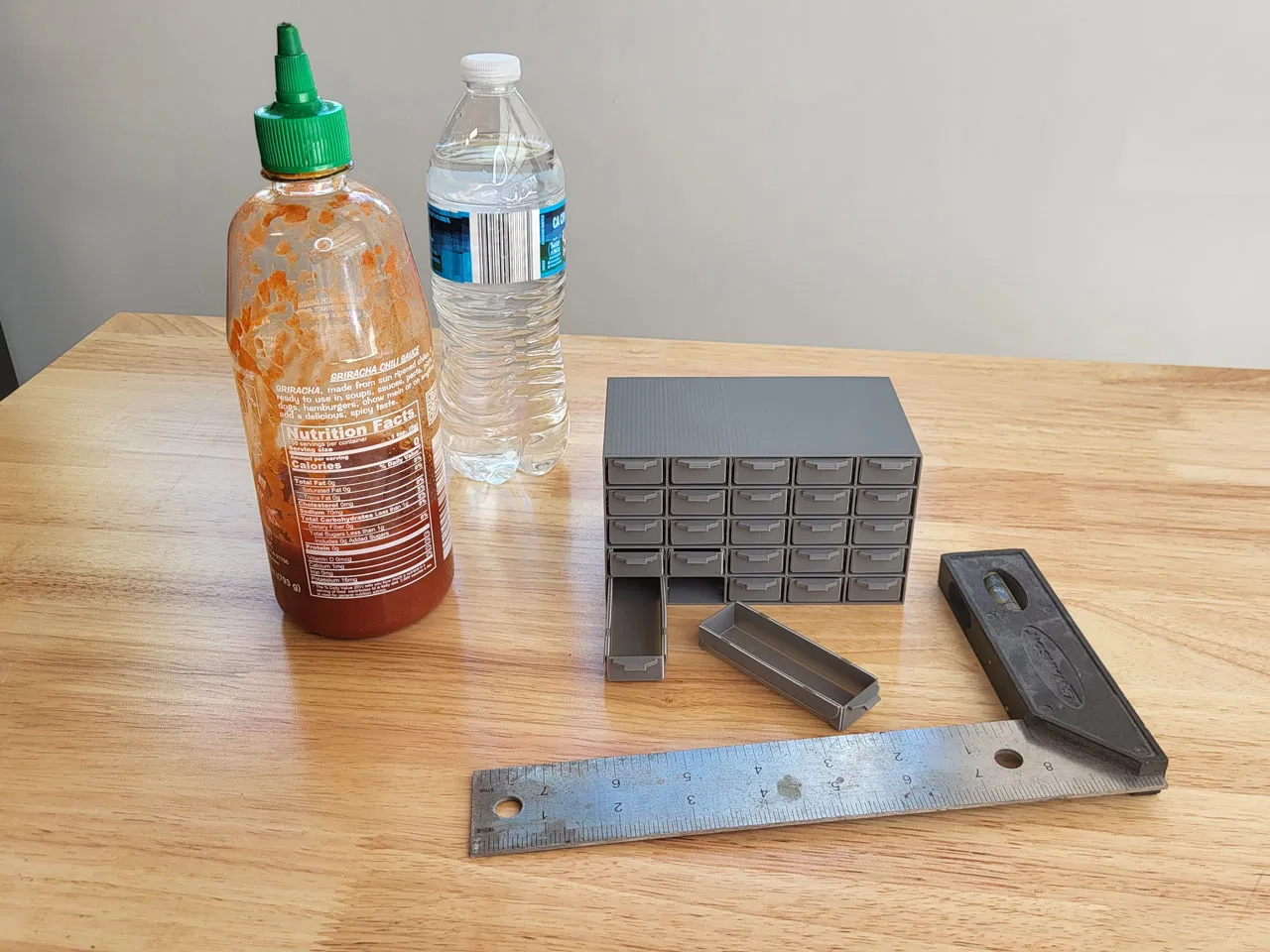 In một cái hộp, và vài cái MiniTray để làm ngăn kéo. Số lượng MiniTray cần in sẽ tùy thuộc vào loại hộp bạn in. Nhớ là càng in nhiều ngăn kéo thì càng tốn công gấp/lắp ráp.