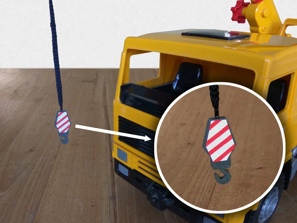 Móc cẩu đồ chơi (thay thế) cho đồ chơi xây dựng. Có một lỗ nhỏ để gắn/dán dây cẩu vô móc. In nhanh gọn lẹ, không cần support nha.