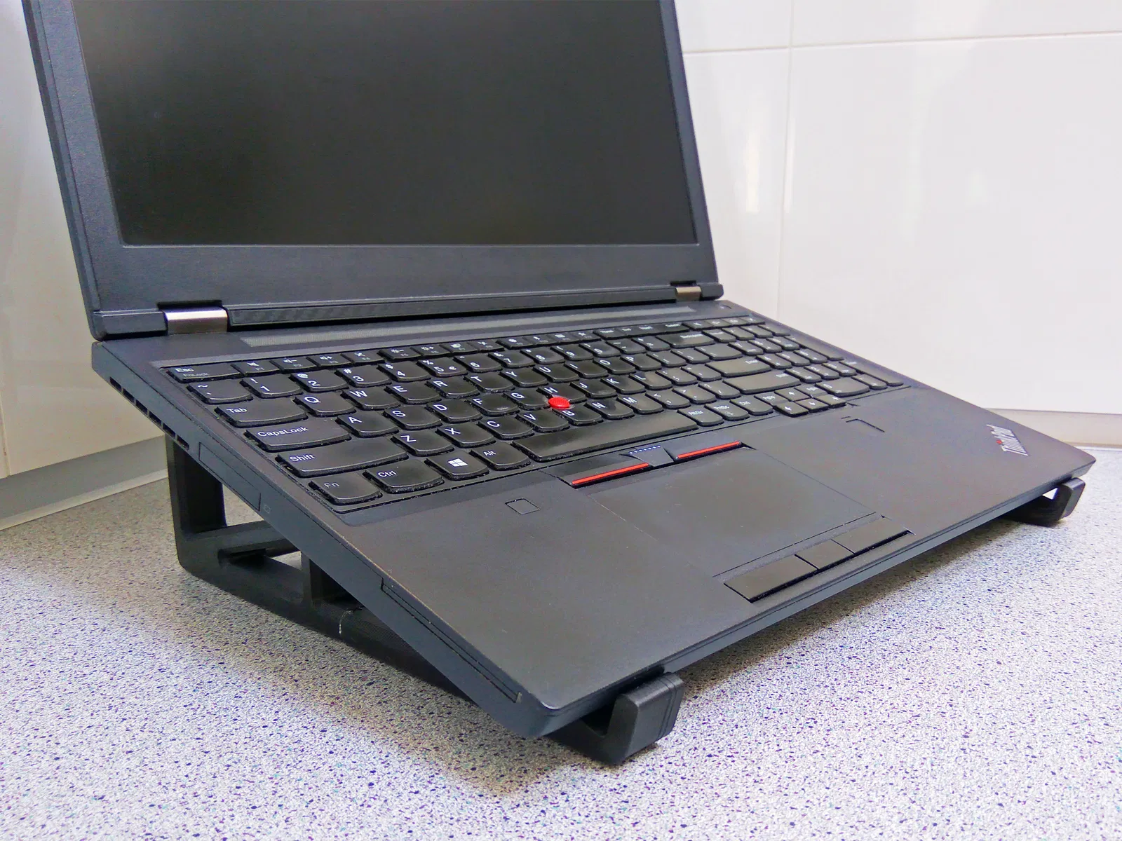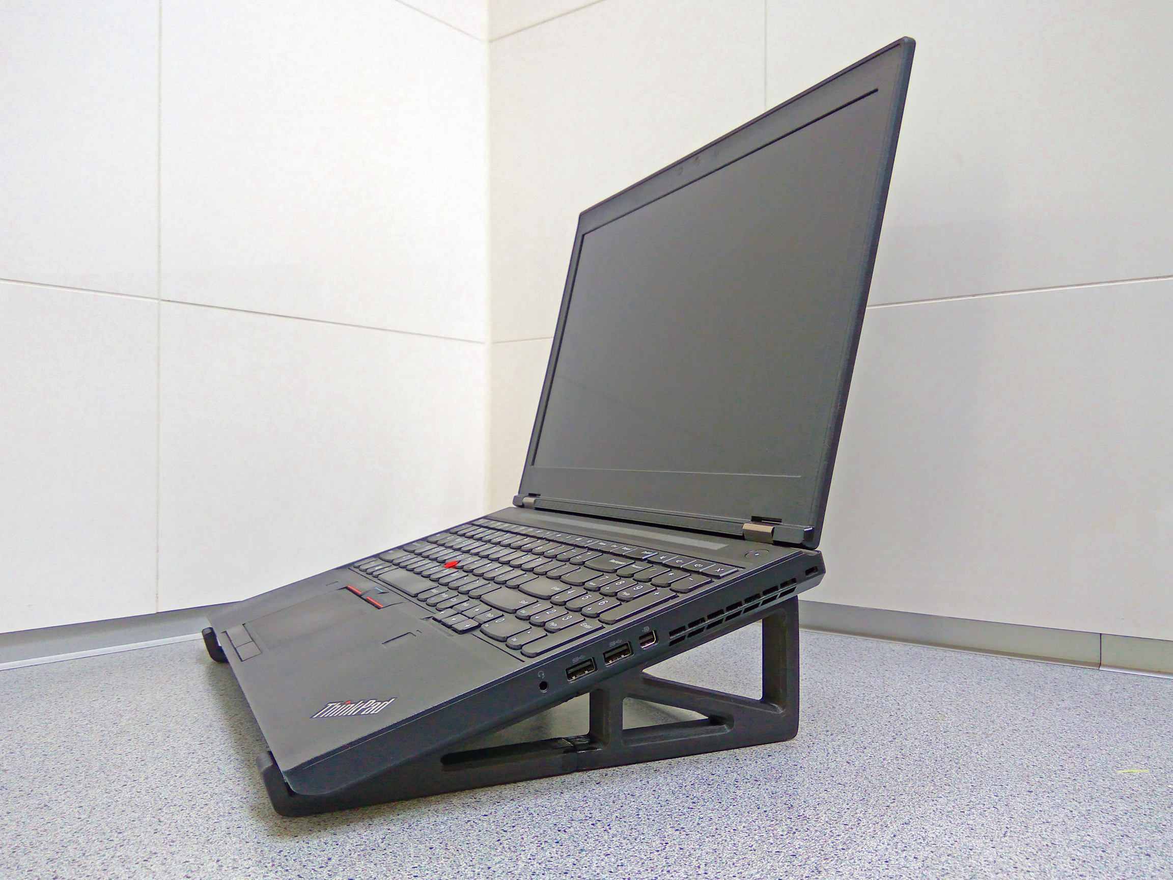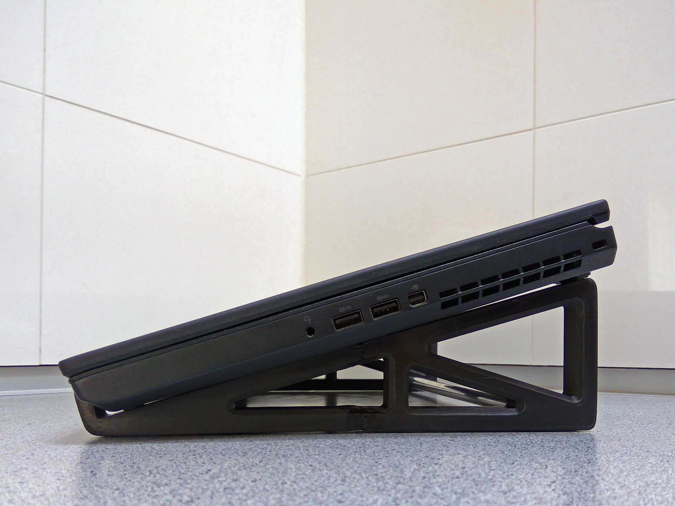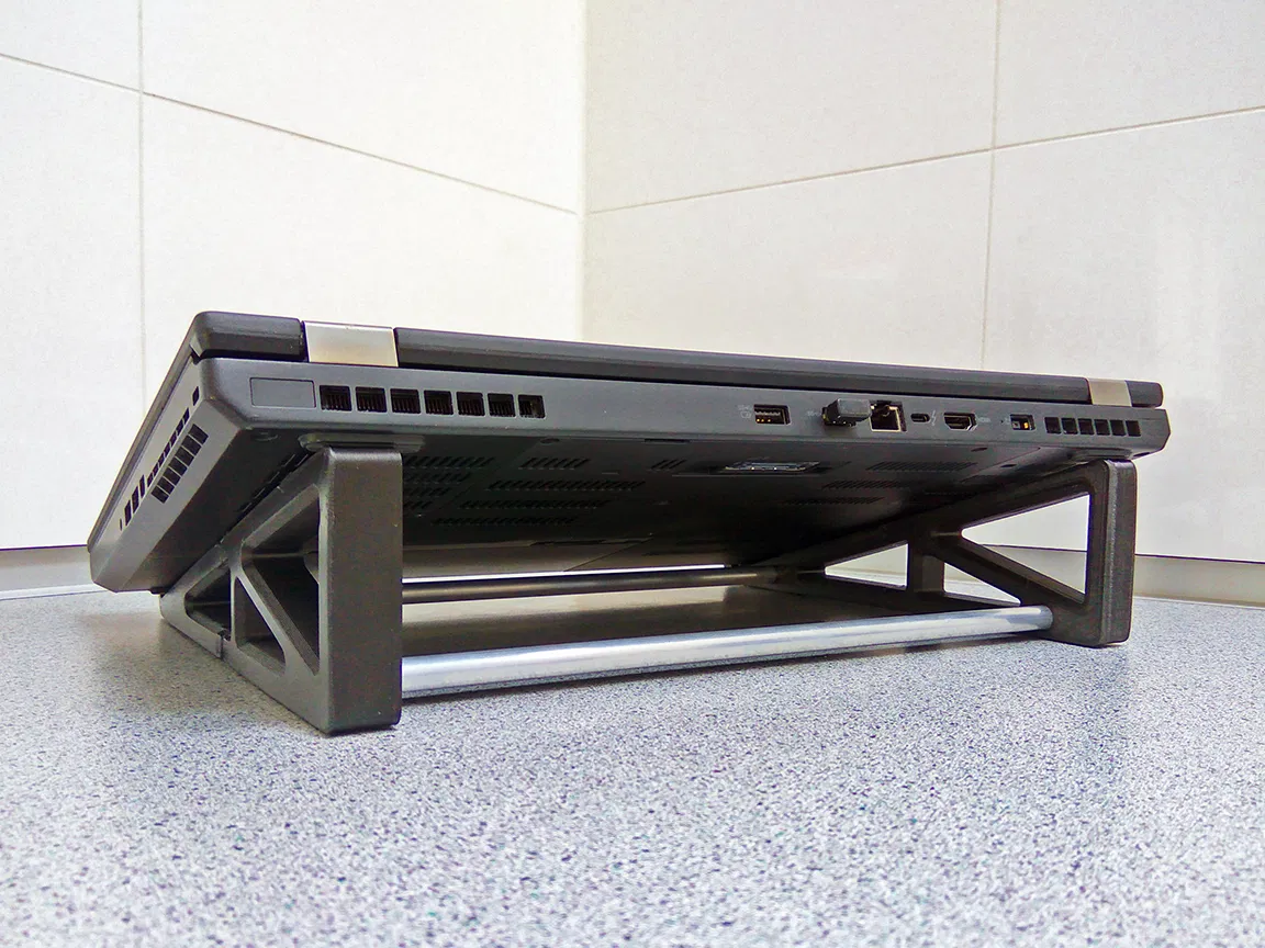 Chân đế laptop này, phù hợp với laptop 15 inch, nâng mặt sau lên khoảng 7 cm. Chiều rộng có thể tùy chỉnh bằng ống nhôm 10mm. Bạn có thể in phiên bản voronoi hoặc in trực tiếp trên Prusa i3 MK3(s). Có thể dán thêm miếng vá lốp xe để chống trượt.
