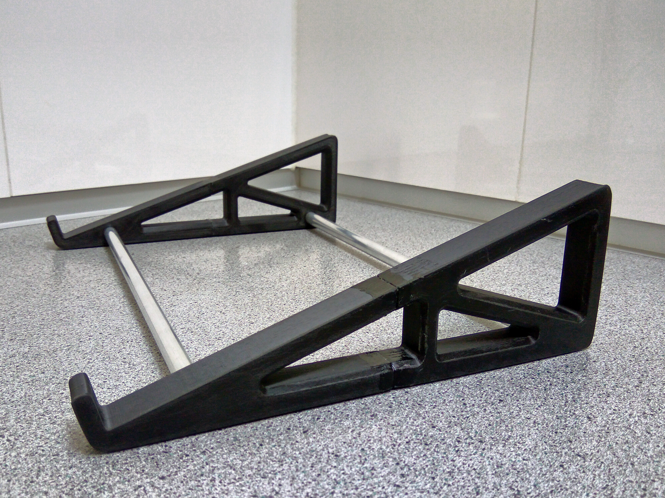Chân đế laptop này được thiết kế cho laptop 15" và nâng phần sau của laptop lên khoảng 7 cm. Chiều rộng có thể được tùy chỉnh bằng cách sử dụng các đoạn ống (nhôm) ngắn hơn hoặc dài hơn. Các lỗ được thiết kế cho ống 10mm (tôi đã sử dụng ống nhôm 10x1mm). Ngoài ra, tôi đã dán một vài miếng vá lốp xe lên đáy chân đế laptop, giúp nó không bị trượt trên bàn của tôi. Nếu bạn muốn, bạn có thể in phiên bản voronoi (xem bản render).