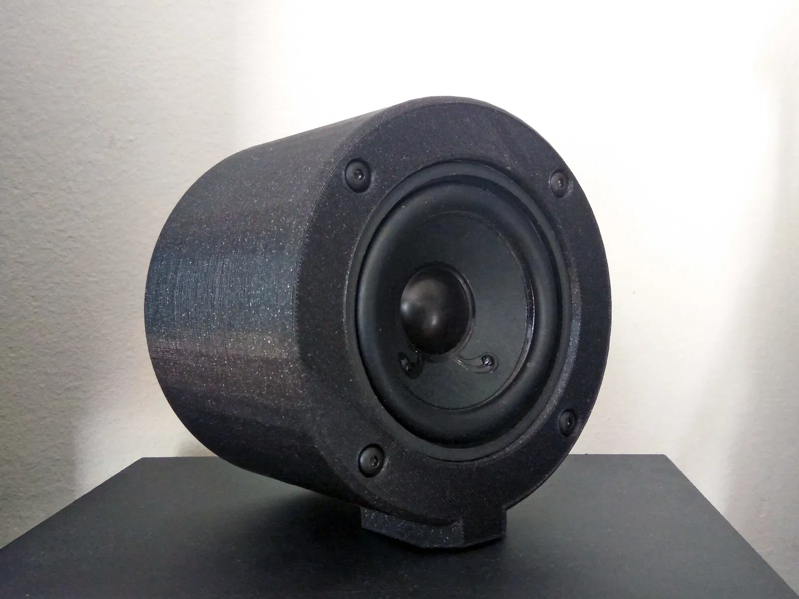 Vỏ loa hai mảnh này có thể dùng để gắn thêm củ loa vào thùng loa có sẵn. Phía dưới có lỗ luồn dây cáp. Cần tạo ren M4 và dùng ốc vít M4 để lắp ráp.