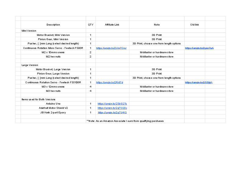 Các tệp bao gồm danh sách vật liệu cho từng kích cỡ, cũng như các liên kết liên kết cho các bộ phận không in 3D.