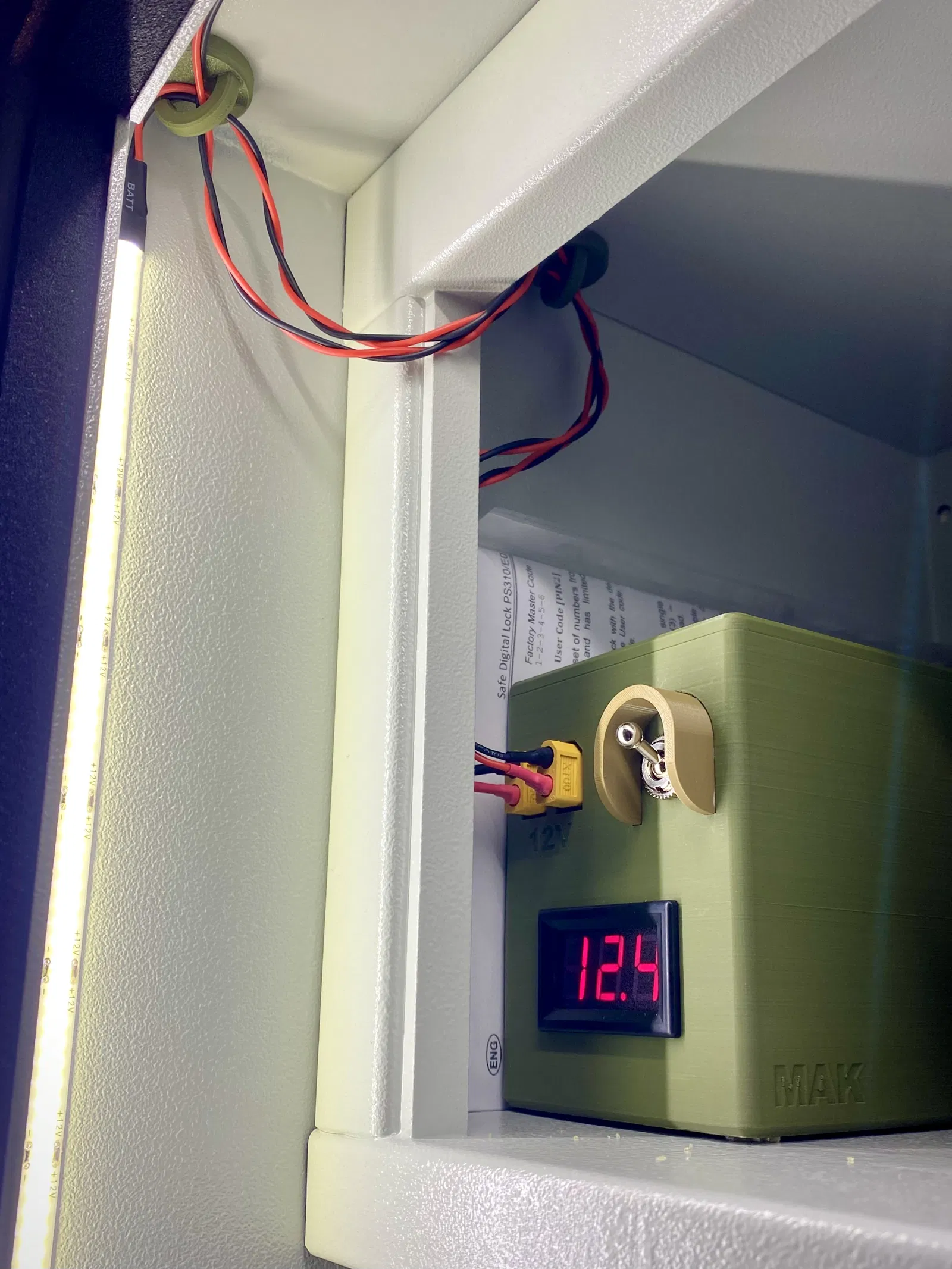 Bộ pin 12V Pb, lý tưởng để chạy dải đèn LED COB 12V, ví dụ như lắp đặt bên trong két sắt đựng súng, nơi không có nguồn điện nào khác và sự an toàn được đề cao.
