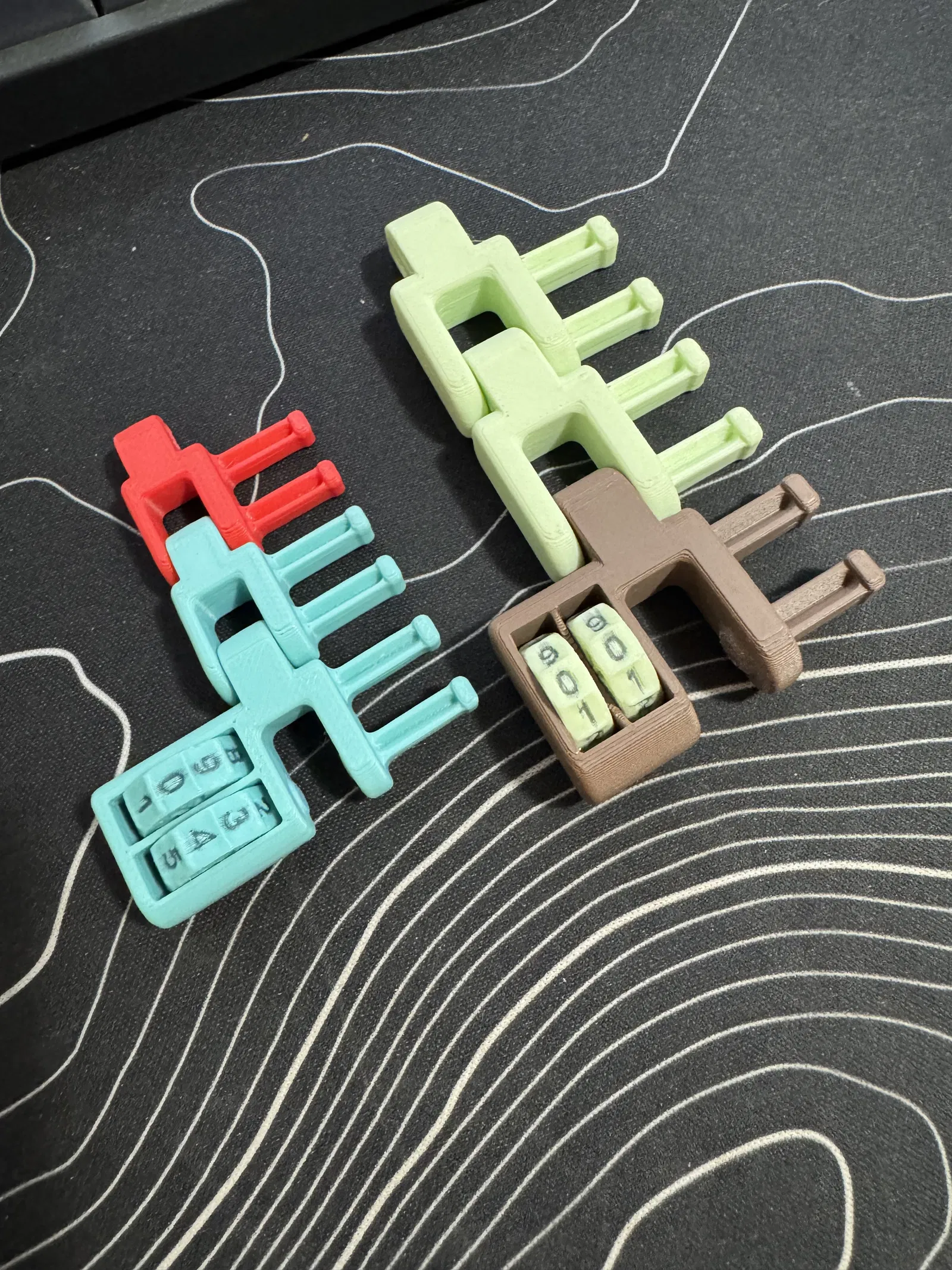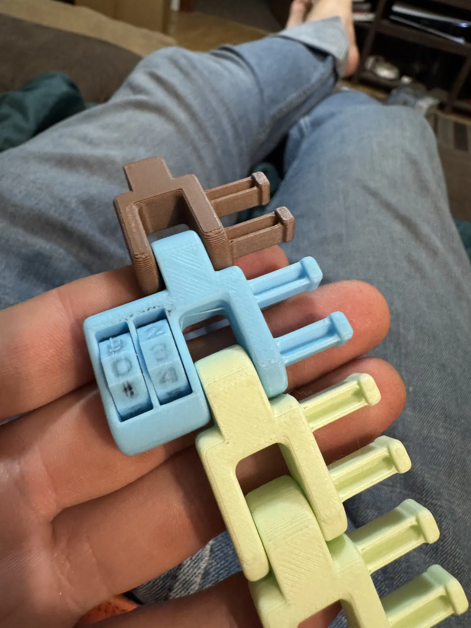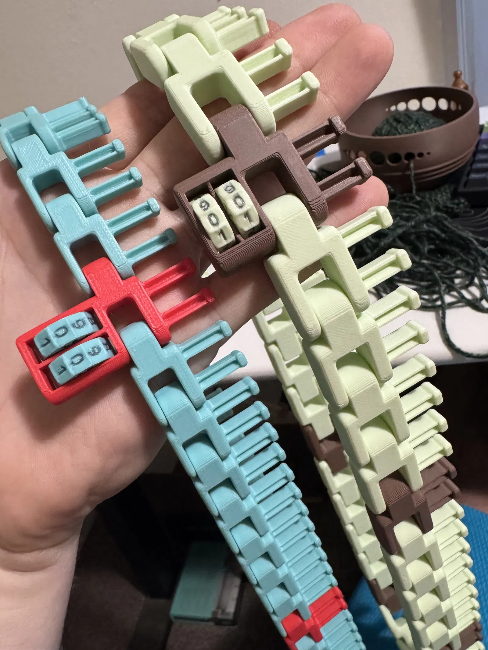 Sau khi đan mấy cái nón với cái khung mới này xong, tui làm liều luôn, thiết kế thêm cái bộ đếm hàng tích hợp vô một trong mấy mắt xích luôn! Mấy cái núm xoay thì ép vô mấy cái khe, với có khấc để cố định theo từng số luôn!