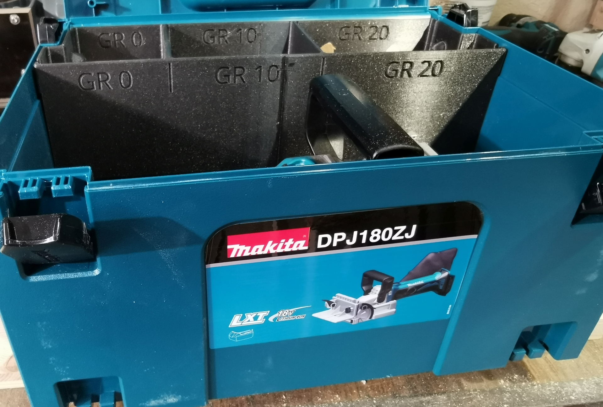 Hộp Lamello Makita DPJ180 Plate Joiner Flachdübelfräse in 2 nửa, kết nối bằng chốt trụ hoặc keo. Có thể thêm mút xốp để giữ các bộ phận bên trong khi hộp bị nghiêng.