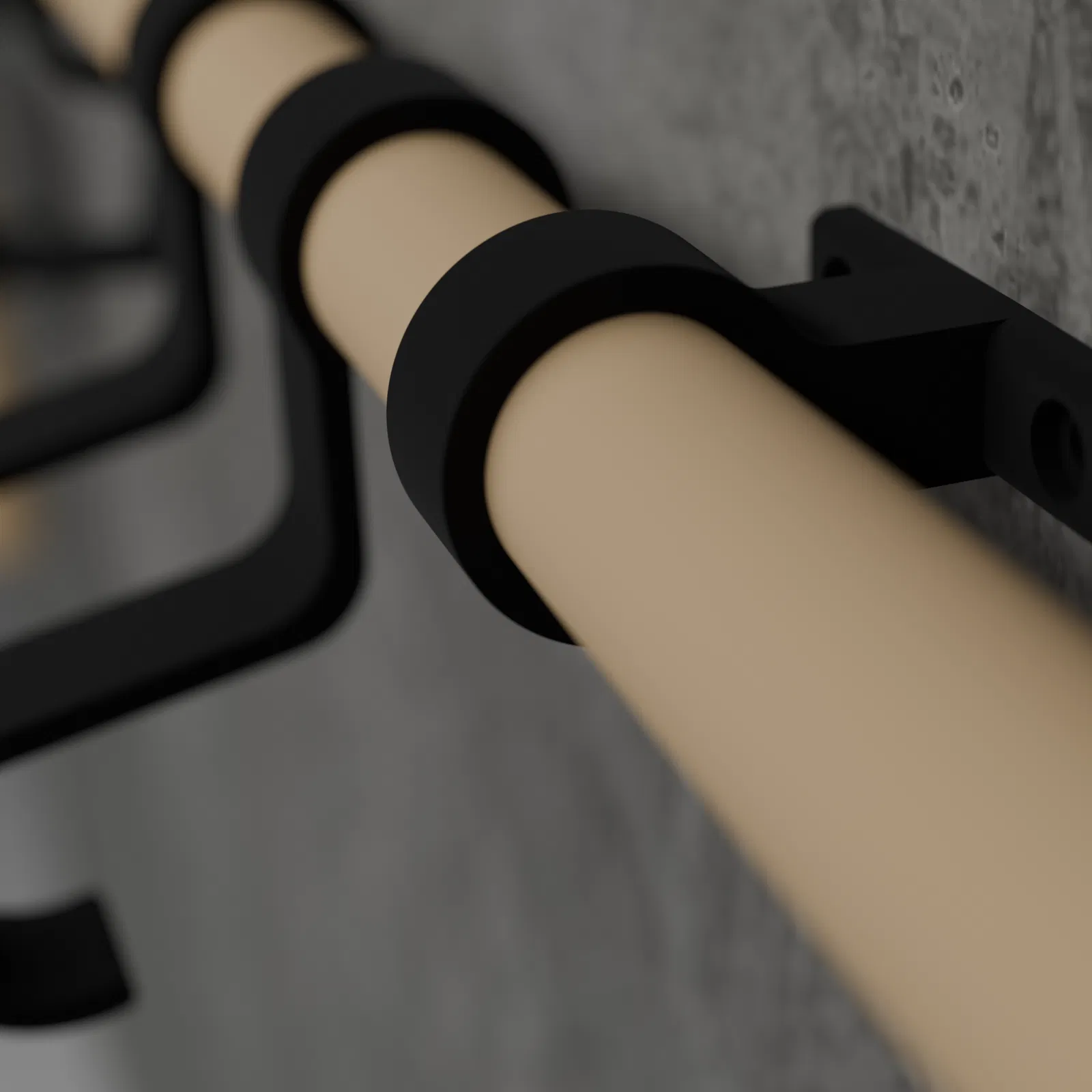Giá đỡ vuông góc có thể được bắt vít vào tường thạch cao / thanh đỡ (studs), và được thiết kế với độ khít rất chặt giữa thanh gỗ và phần in 3D. Bạn nên dùng búa cao su để lắp hoàn toàn thanh gỗ mong muốn vào giá đỡ vuông góc.