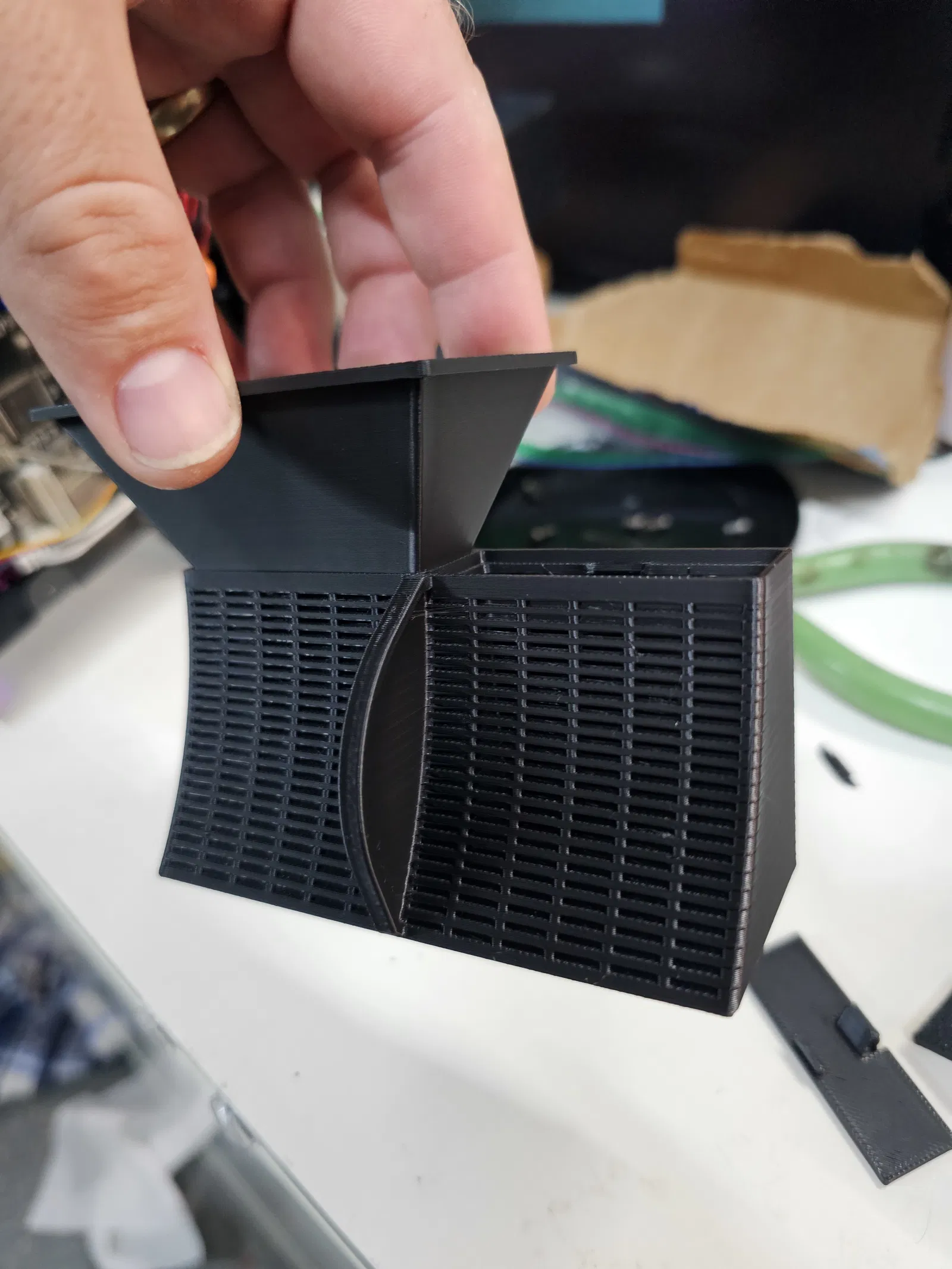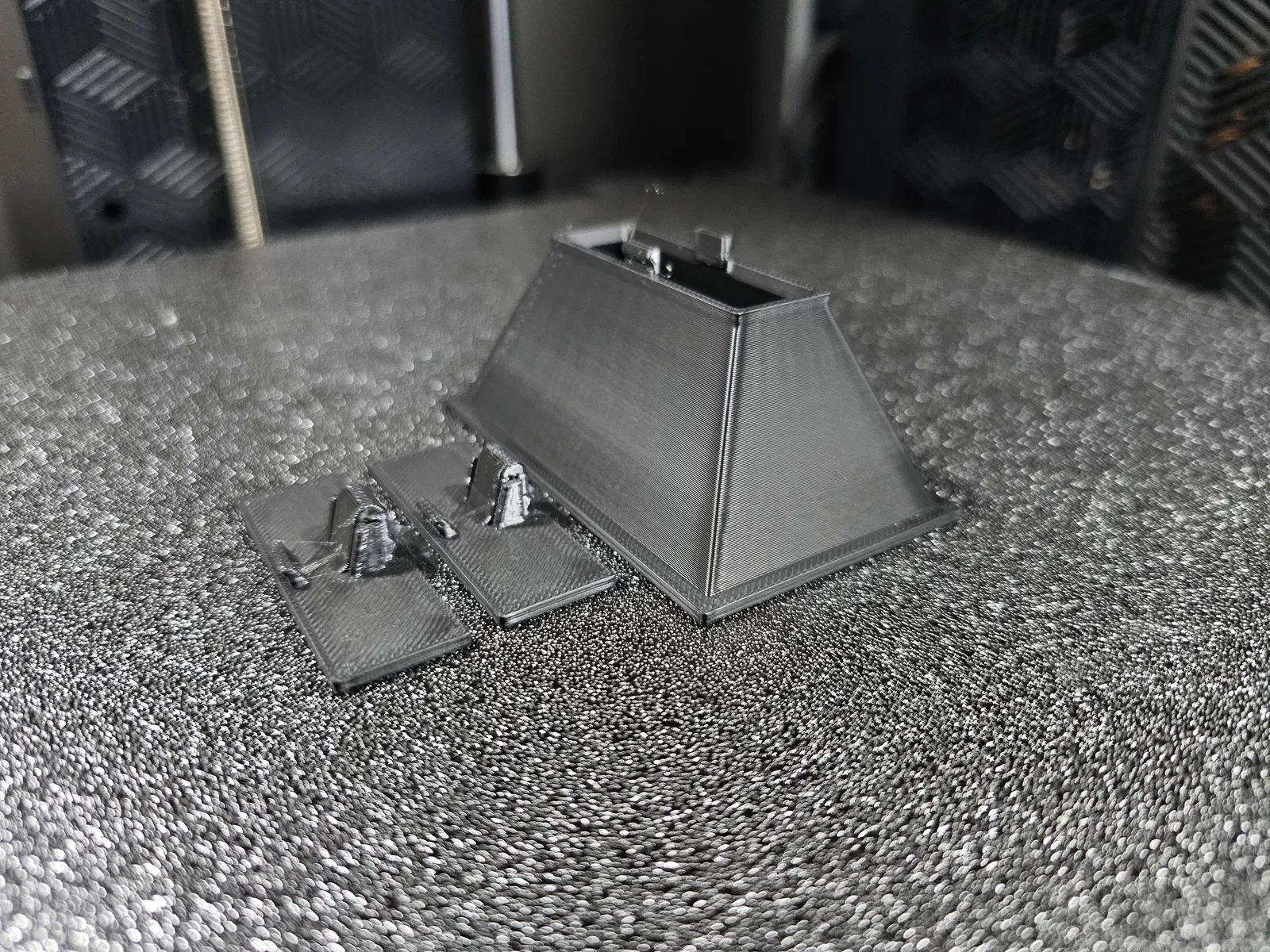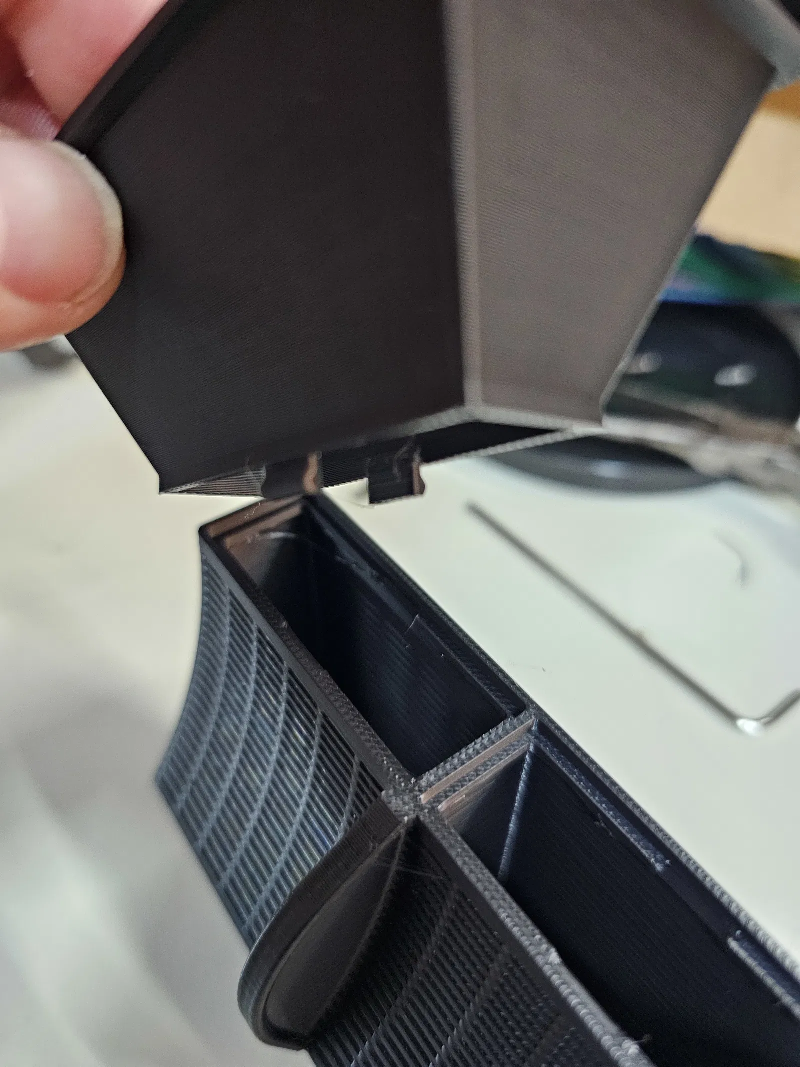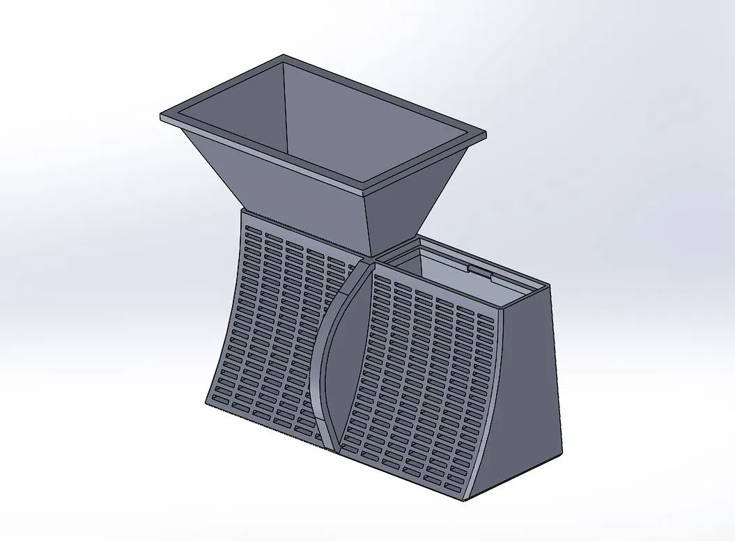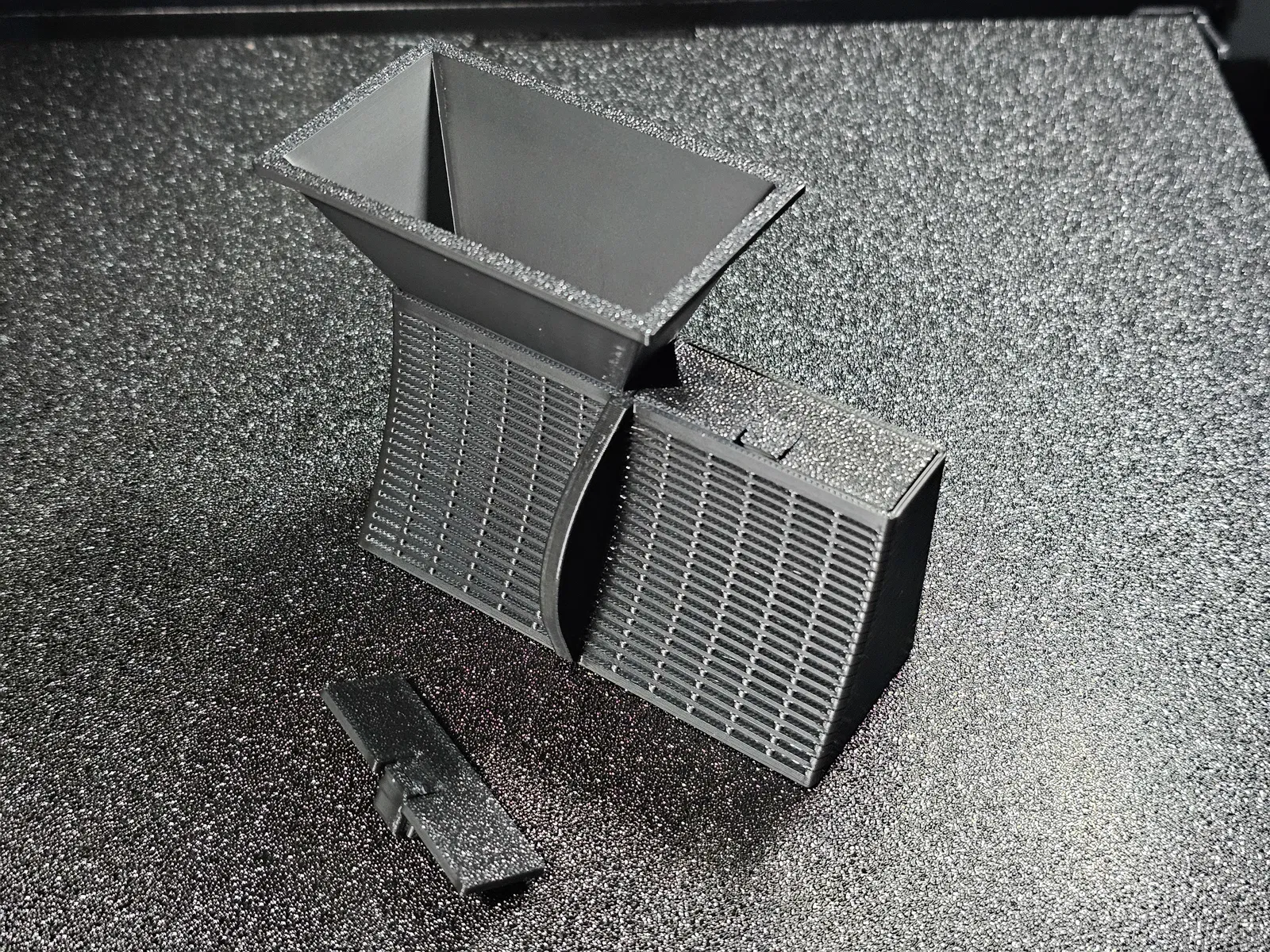 Muốn có cái gì đó mà tôi có thể đổ đầy và làm khô trên bàn làm việc, dễ dàng đặt và tháo ra khỏi CFS. Cũng dễ in mà không cần support. Lớp 0.2, đầu phun 0.4, phần mỏng nên 3 lớp tường và 6 lớp trên/dưới gần như làm nó đặc. Có một phần giống lò xo nên tôi khuyên dùng PETG, nhưng cái gì cũng được. ABS hoặc ASA cho phép bạn đặt hộp đã làm khô vào máy hút ẩm của mình.